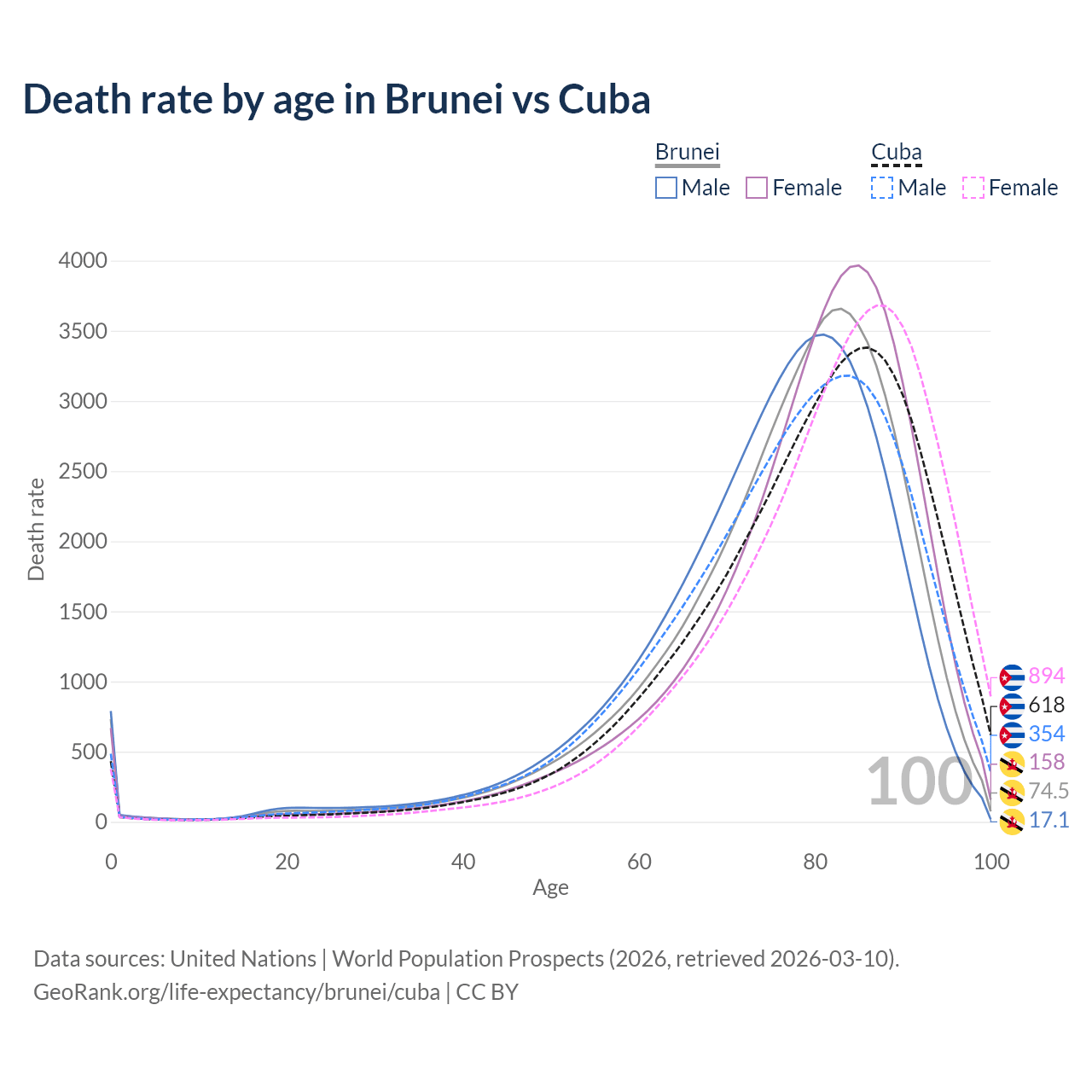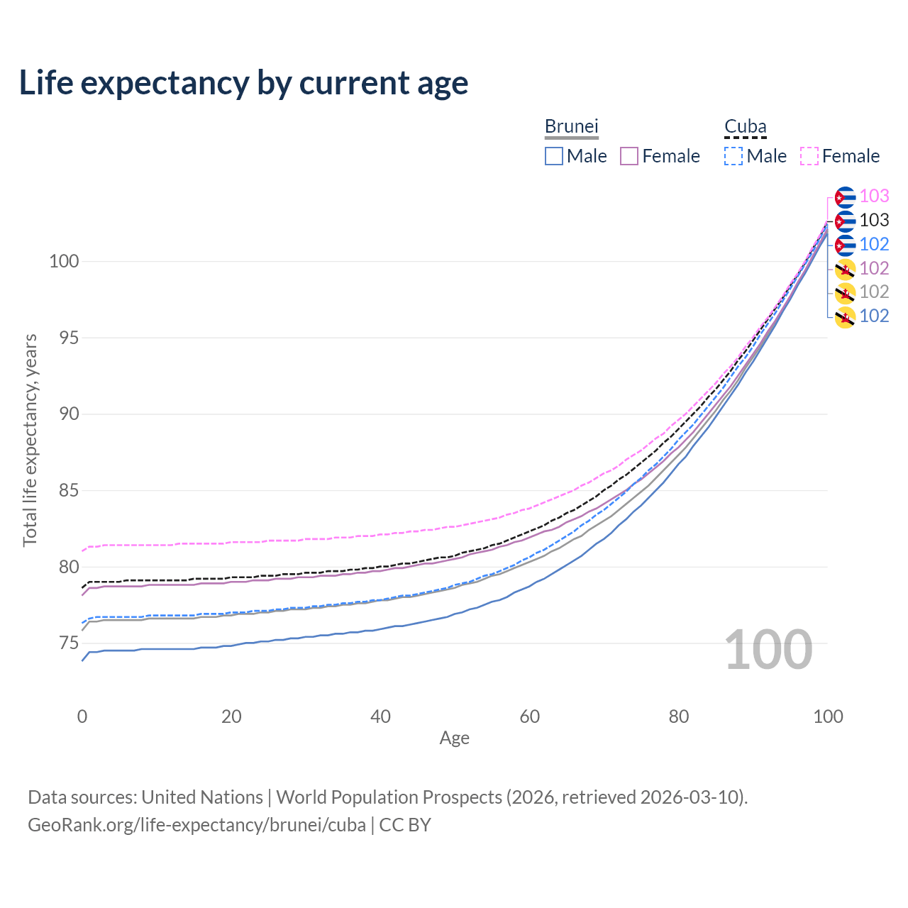 This life expectancy calculator shows the odds of living to 100, 95, 90, and below based on current age for both males and females in Brunei and Cuba, along with mean and median age of death. The calculations are based on the 2026 life tables (actuarial tables) from the UN World Population Prospects.