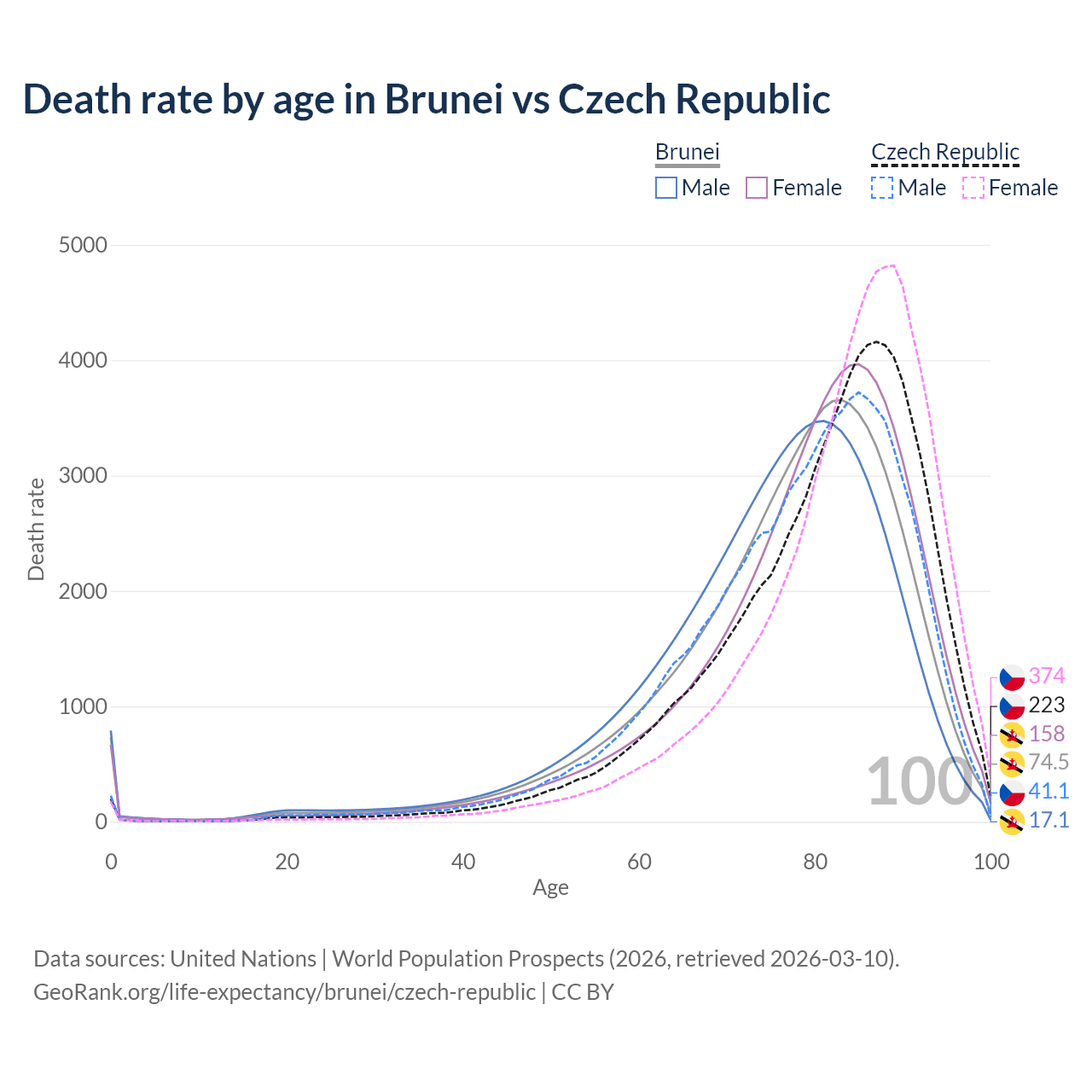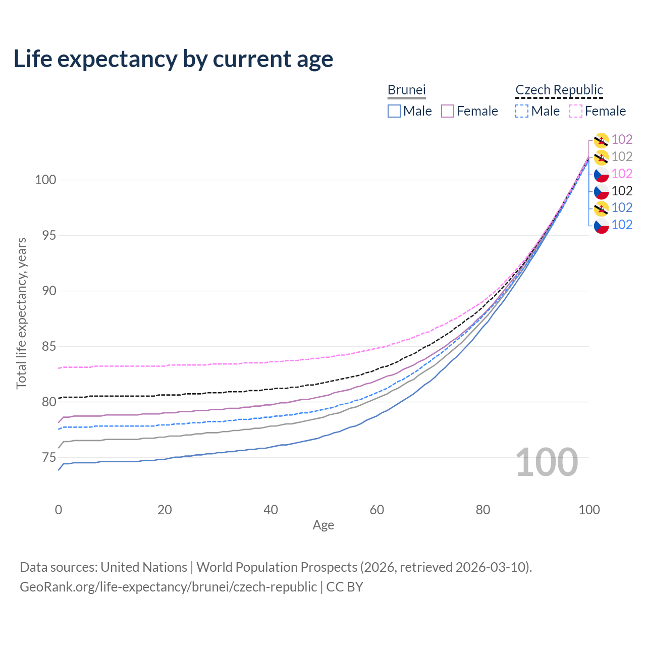 This life expectancy calculator shows the odds of living to 100, 95, 90, and below based on current age for both males and females in Brunei and the Czech Republic, along with mean and median age of death. The calculations are based on the 2026 life tables (actuarial tables) from the UN World Population Prospects.