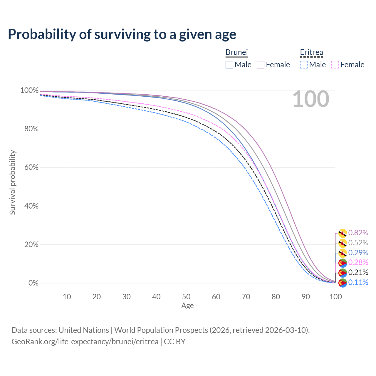 This life expectancy calculator shows the odds of living to 100, 95, 90, and below based on current age for both males and females in Brunei and Eritrea, along with mean and median age of death. The calculations are based on the 2026 life tables (actuarial tables) from the UN World Population Prospects.