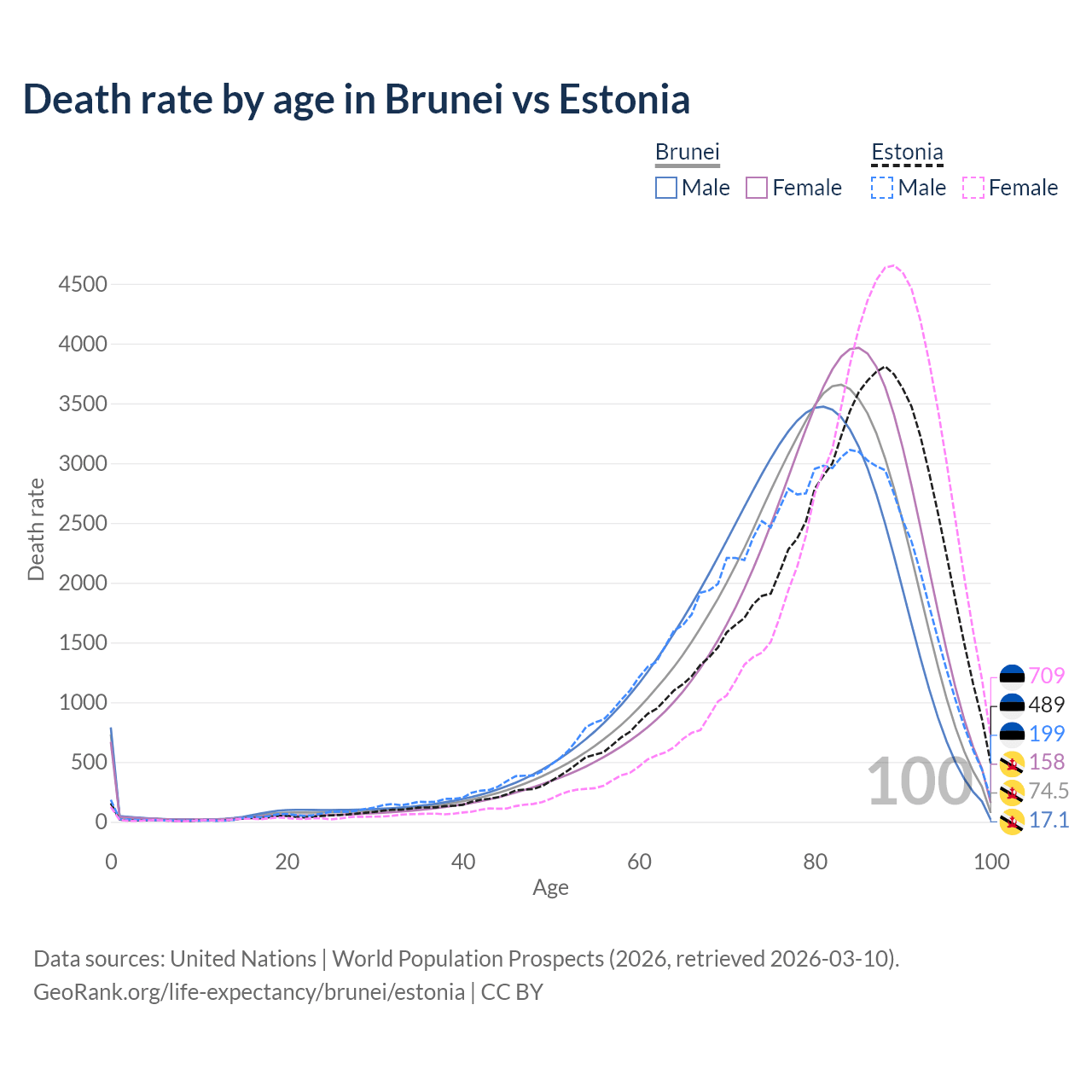 In Brunei, the most common age of death is 83, compared to 88 in Estonia. The median age of death is 79.2 in Brunei and 83.1 in Estonia, meaning only half of each cohort is expected to live past that age.