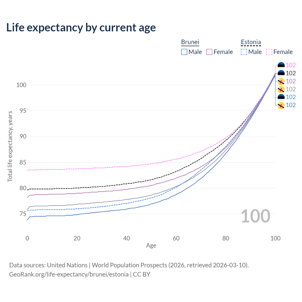 This life expectancy calculator shows the odds of living to 100, 95, 90, and below based on current age for both males and females in Brunei and Estonia, along with mean and median age of death. The calculations are based on the 2026 life tables (actuarial tables) from the UN World Population Prospects.