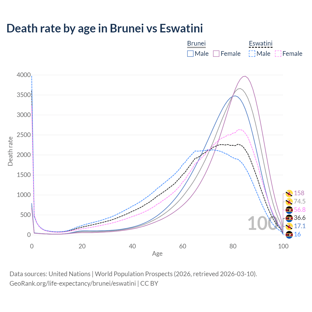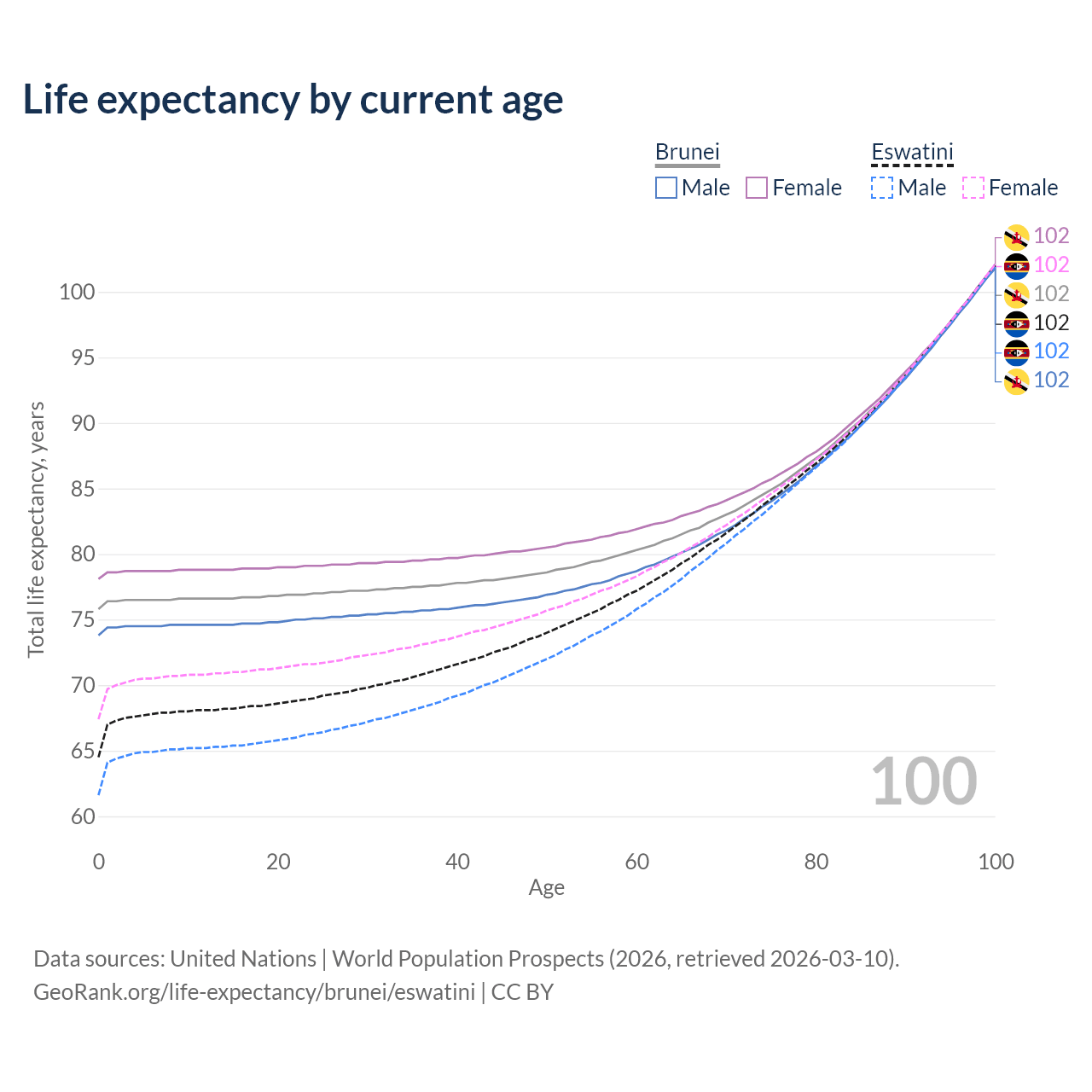 This life expectancy calculator shows the odds of living to 100, 95, 90, and below based on current age for both males and females in Brunei and Eswatini, along with mean and median age of death. The calculations are based on the 2026 life tables (actuarial tables) from the UN World Population Prospects.