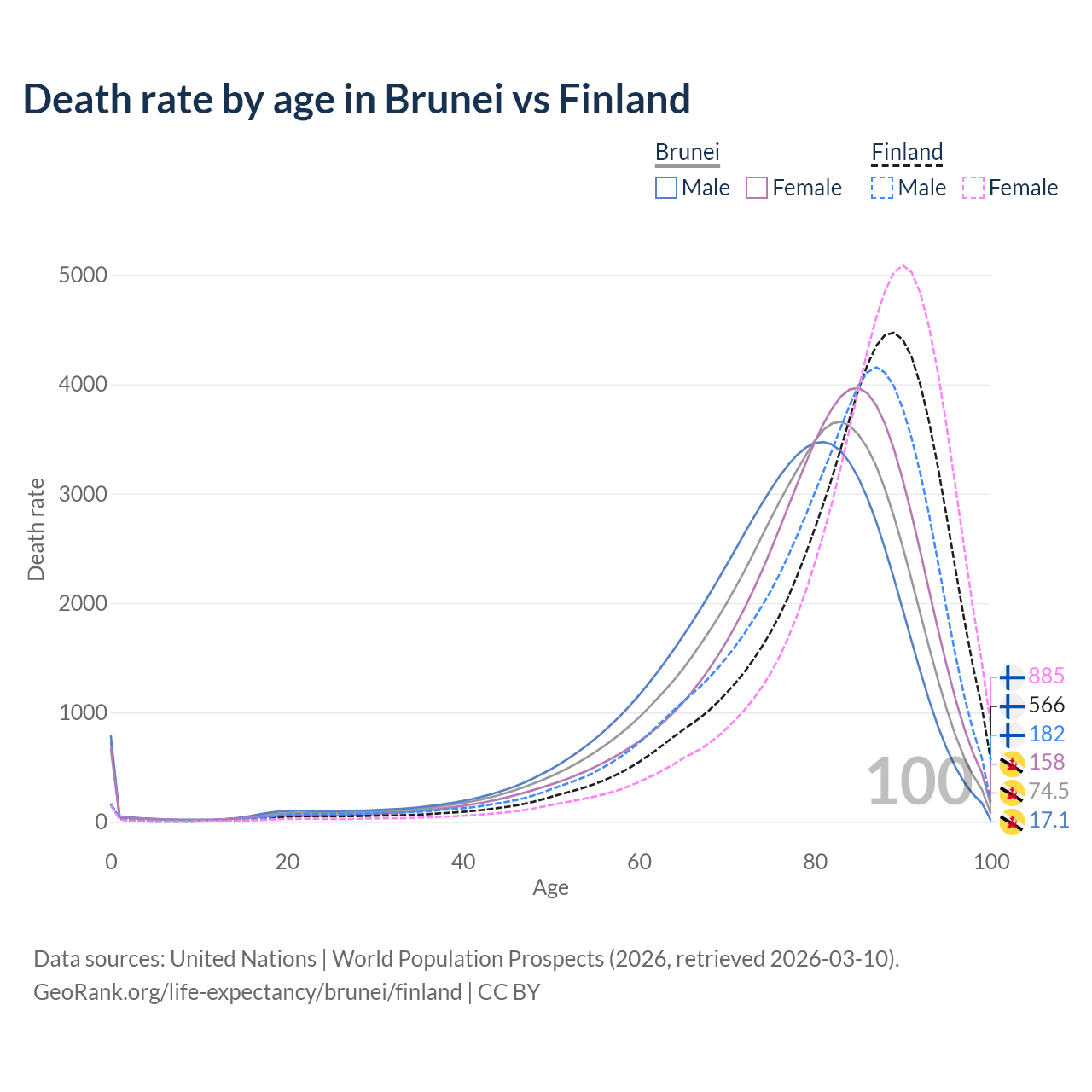 In Brunei, the most common age of death is 83, compared to 89 in Finland. The median age of death is 79.2 in Brunei and 85.6 in Finland, meaning only half of each cohort is expected to live past that age.
