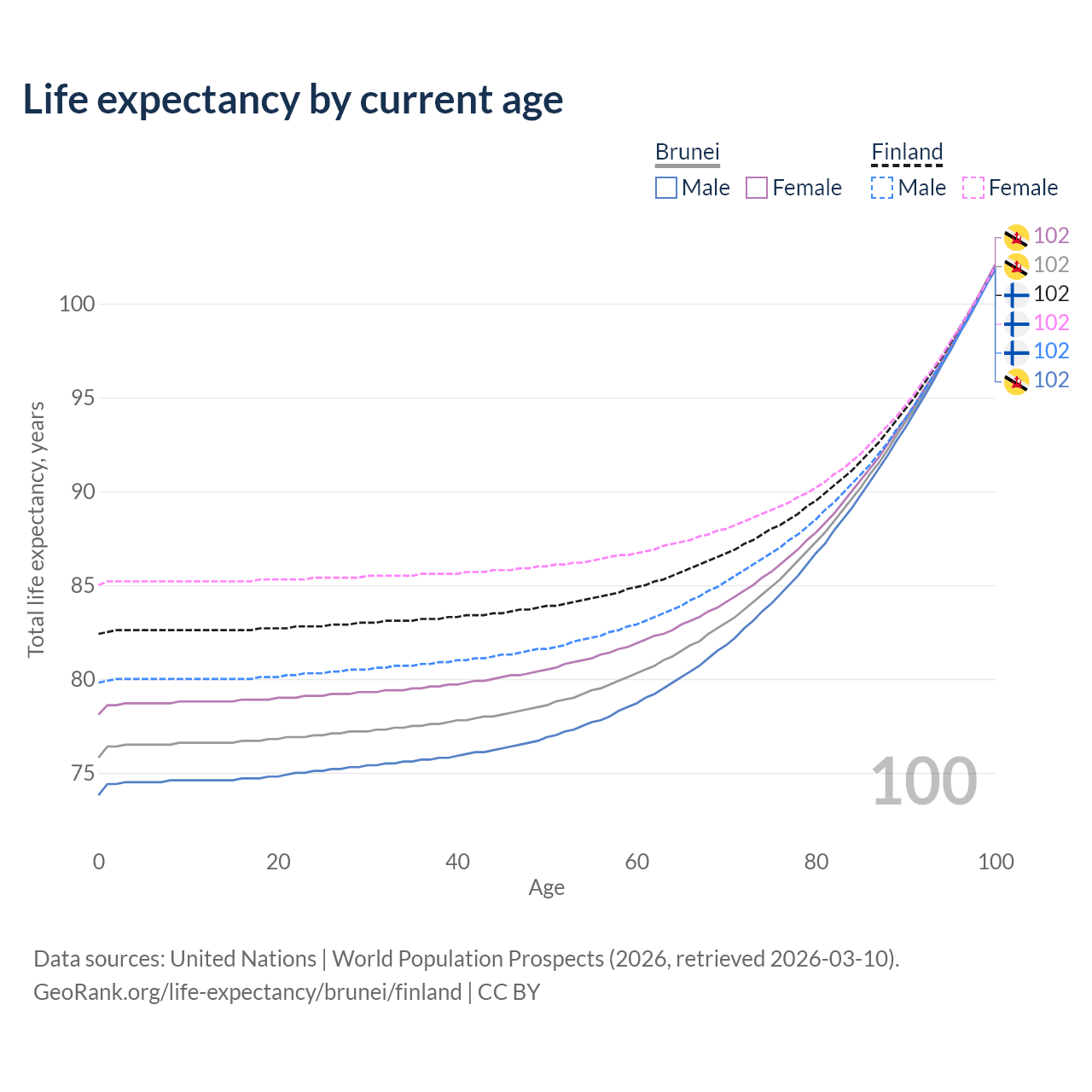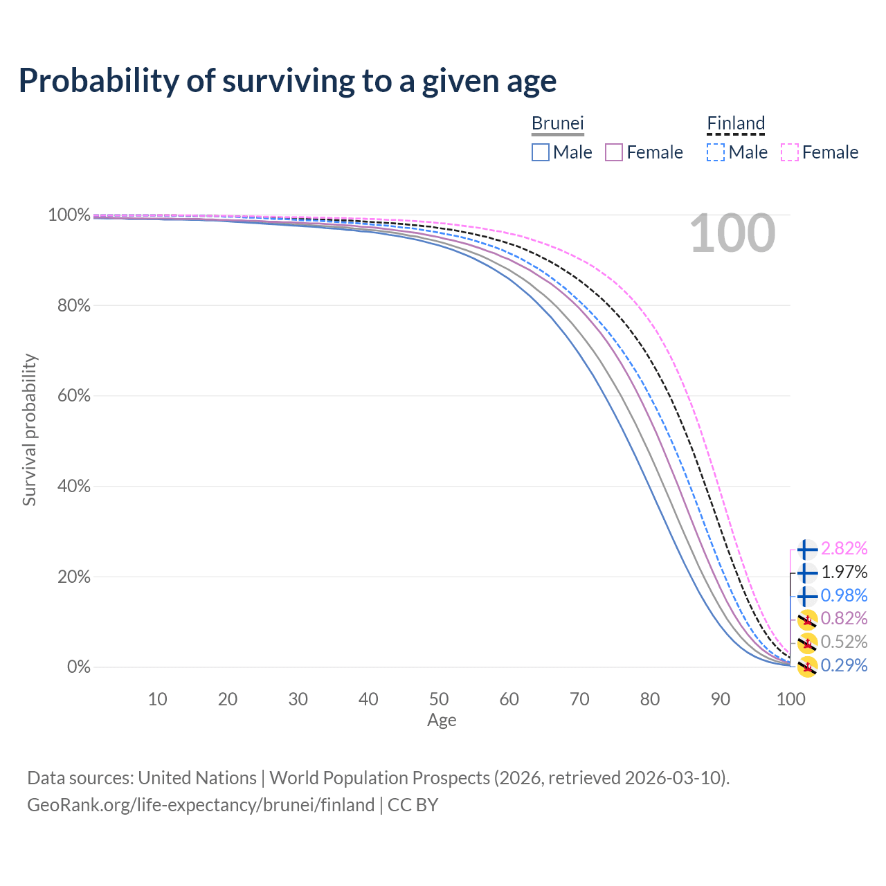 This life expectancy calculator shows the odds of living to 100, 95, 90, and below based on current age for both males and females in Brunei and Finland, along with mean and median age of death. The calculations are based on the 2026 life tables (actuarial tables) from the UN World Population Prospects.