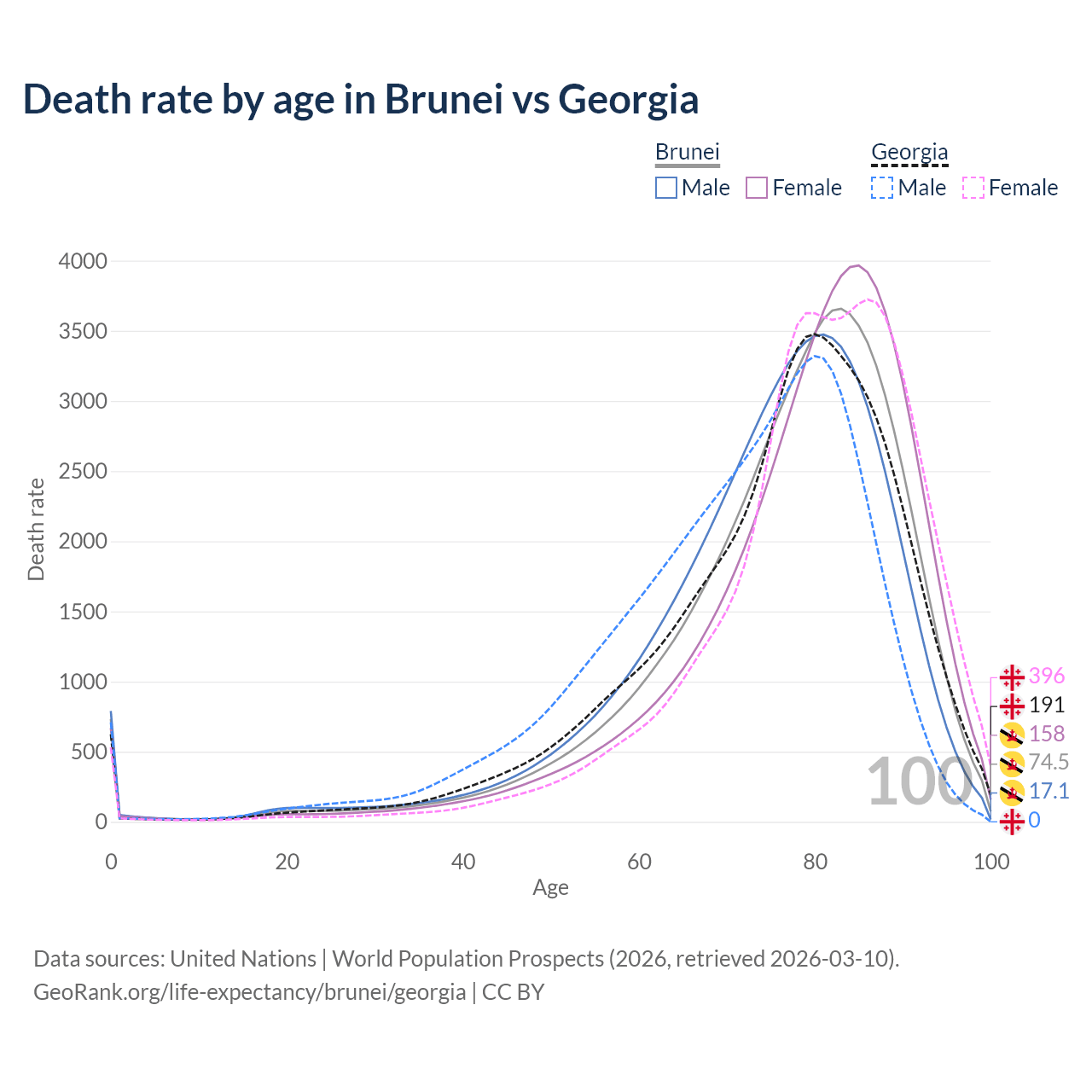 In Brunei, the most common age of death is 83, compared to 80 in Georgia. The median age of death is 79.2 in Brunei and 78.2 in Georgia, meaning only half of each cohort is expected to live past that age.