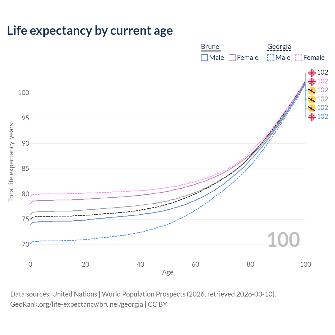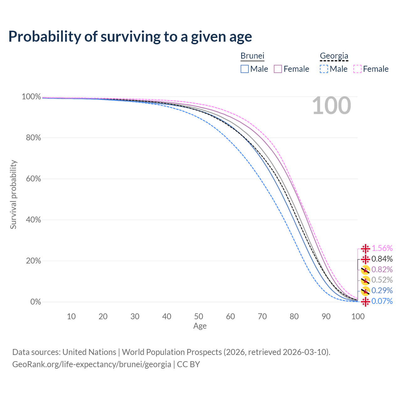 This life expectancy calculator shows the odds of living to 100, 95, 90, and below based on current age for both males and females in Brunei and Georgia, along with mean and median age of death. The calculations are based on the 2026 life tables (actuarial tables) from the UN World Population Prospects.