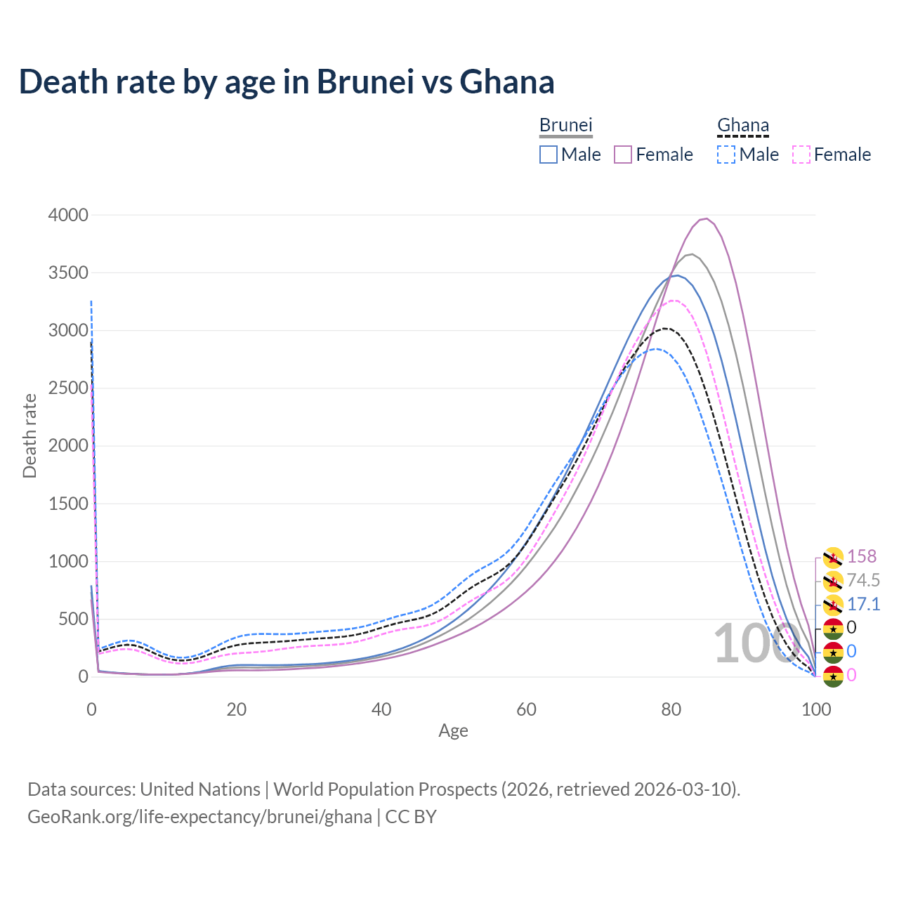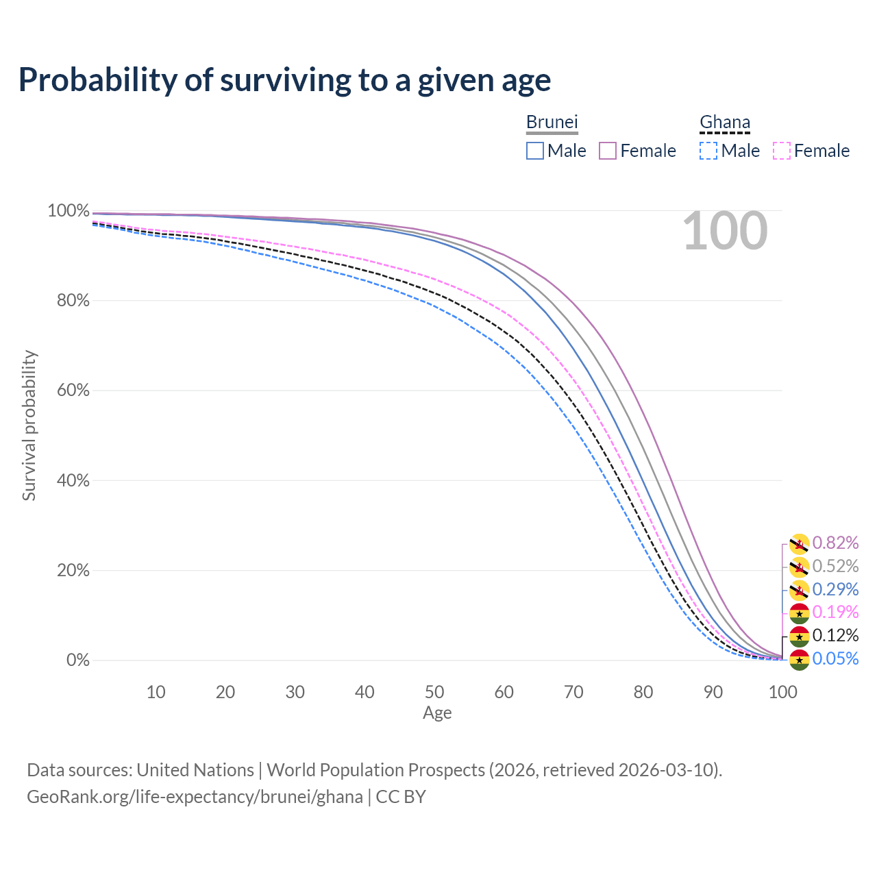 This life expectancy calculator shows the odds of living to 100, 95, 90, and below based on current age for both males and females in Brunei and Ghana, along with mean and median age of death. The calculations are based on the 2026 life tables (actuarial tables) from the UN World Population Prospects.