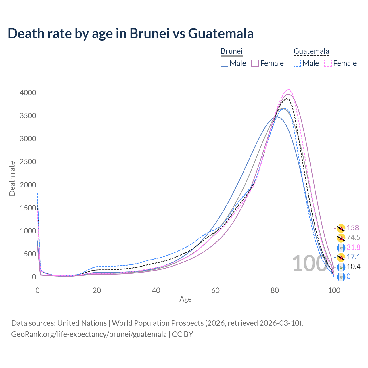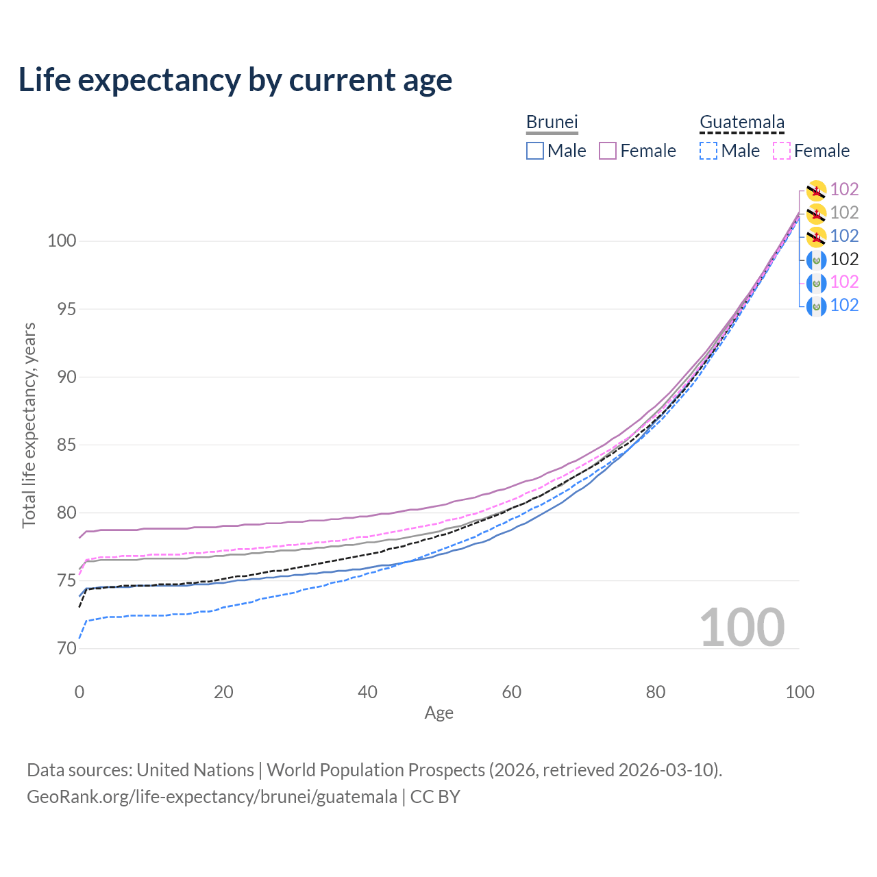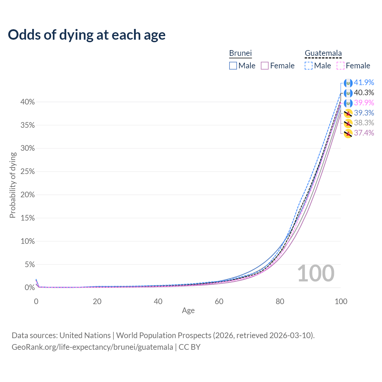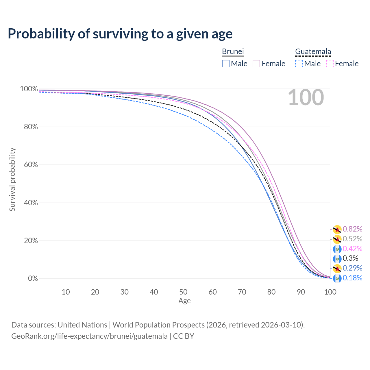 This life expectancy calculator shows the odds of living to 100, 95, 90, and below based on current age for both males and females in Brunei and Guatemala, along with mean and median age of death. The calculations are based on the 2026 life tables (actuarial tables) from the UN World Population Prospects.