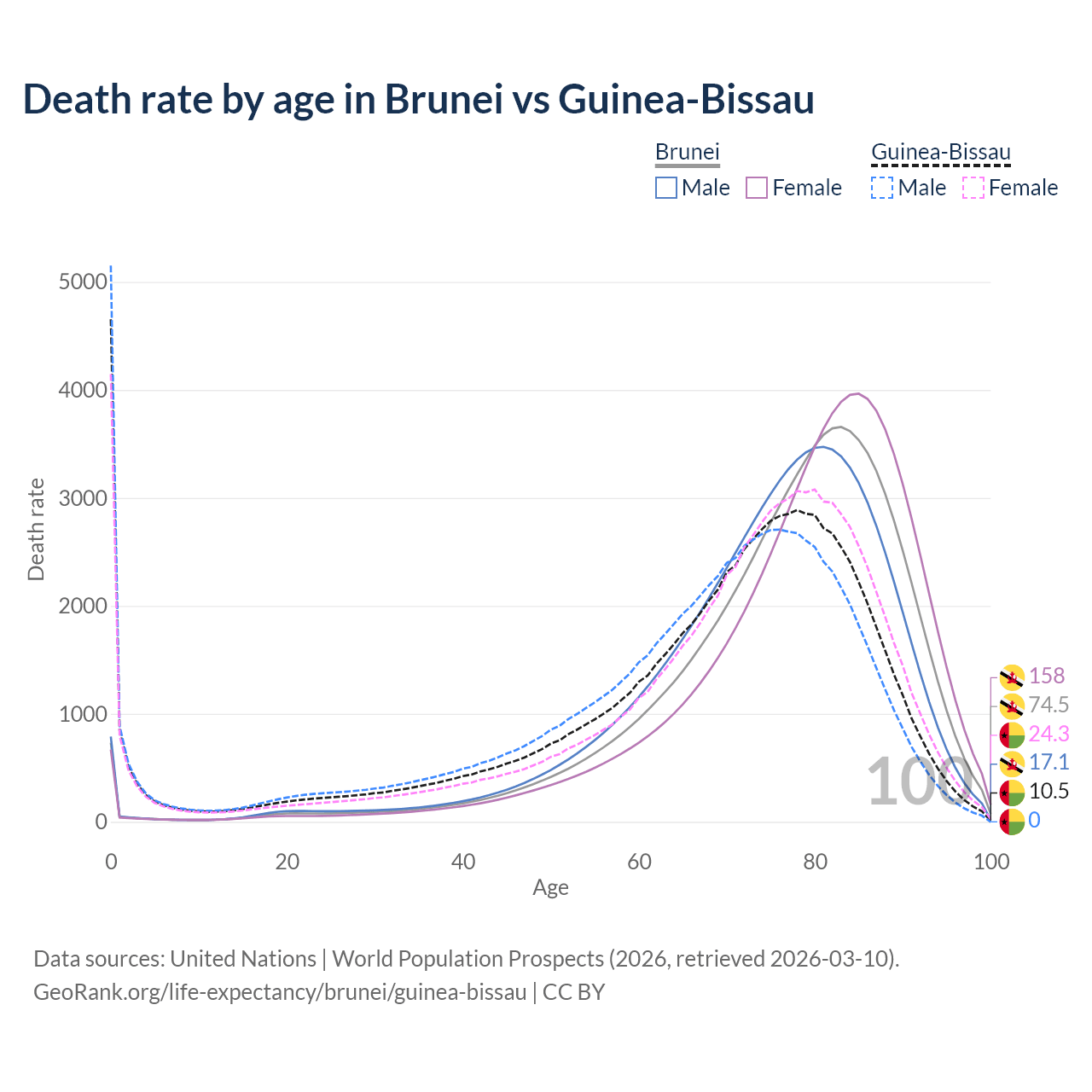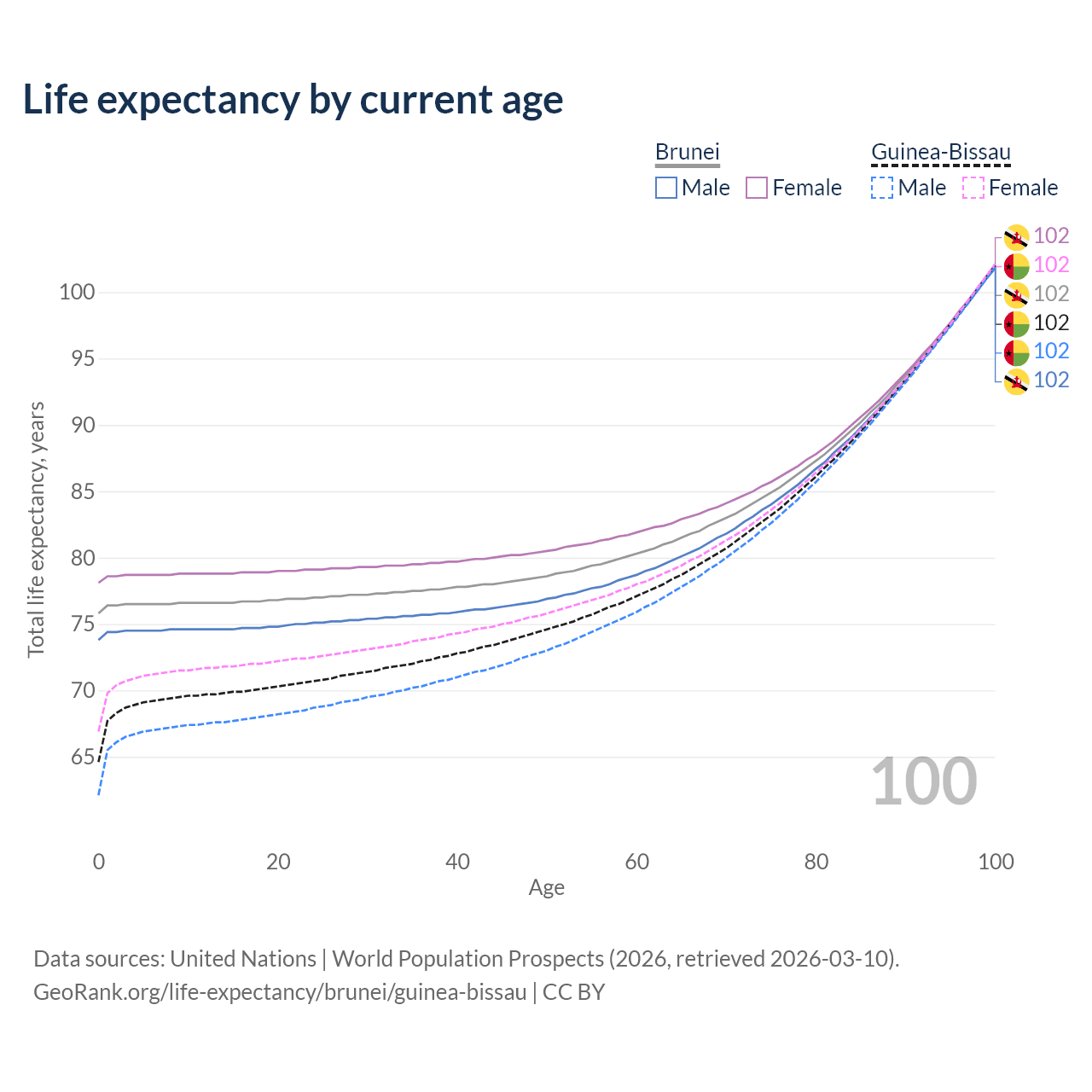 This life expectancy calculator shows the odds of living to 100, 95, 90, and below based on current age for both males and females in Brunei and Guinea-Bissau, along with mean and median age of death. The calculations are based on the 2026 life tables (actuarial tables) from the UN World Population Prospects.