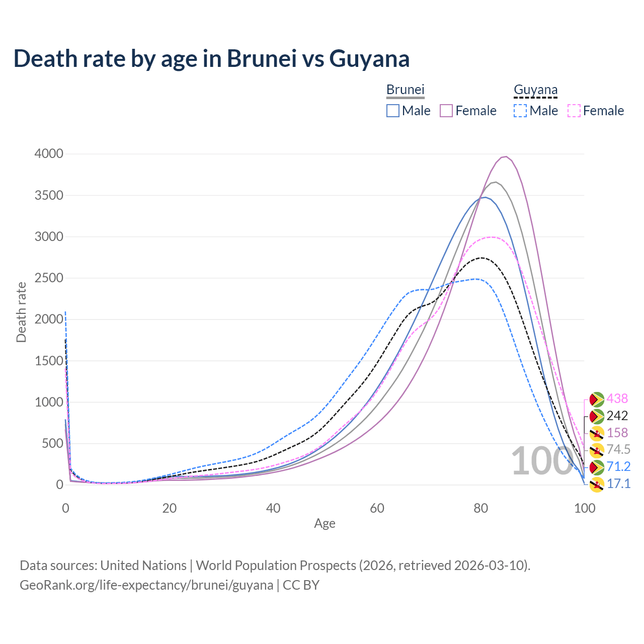In Brunei, the most common age of death is 83, compared to 80 in Guyana. The median age of death is 79.2 in Brunei and 74.1 in Guyana, meaning only half of each cohort is expected to live past that age.