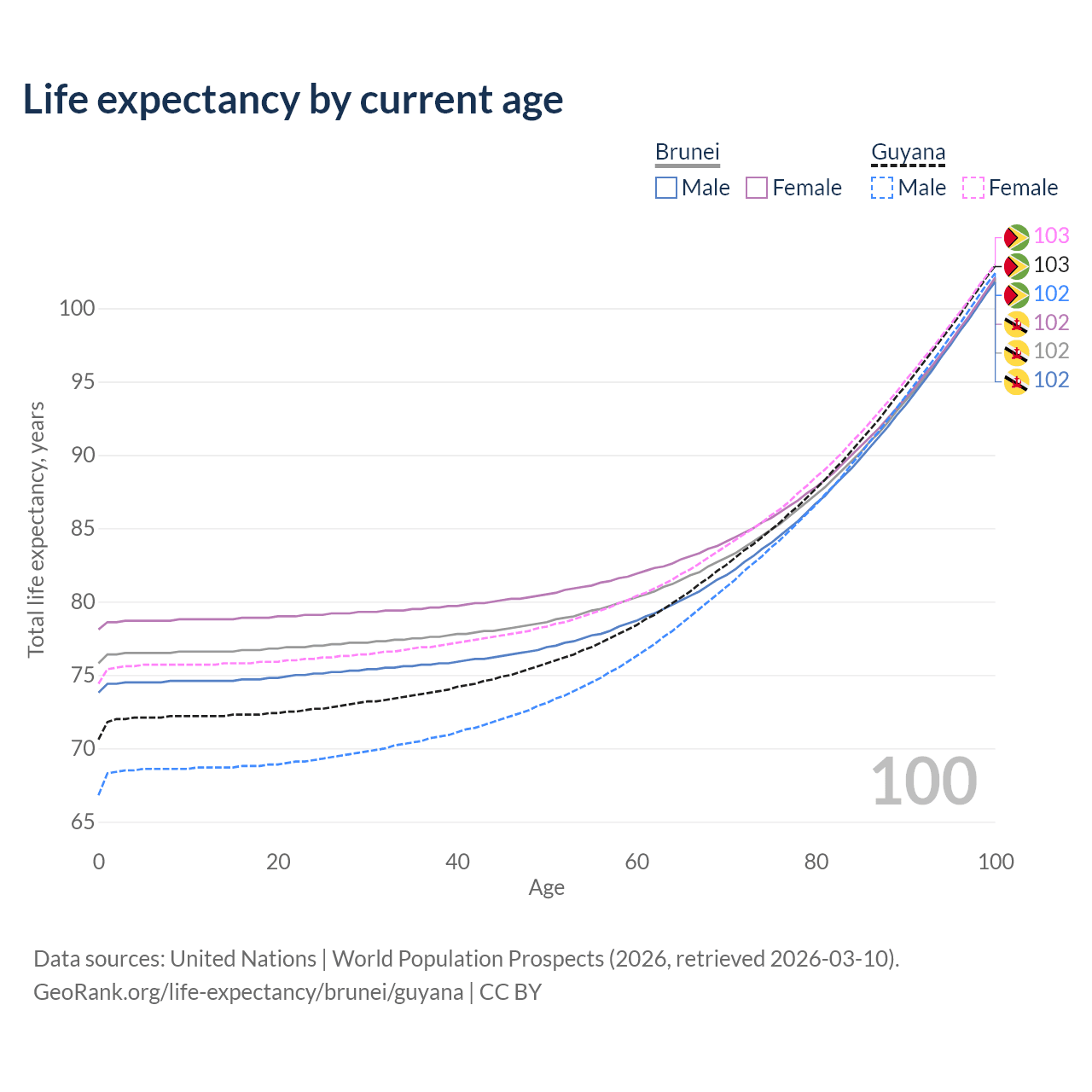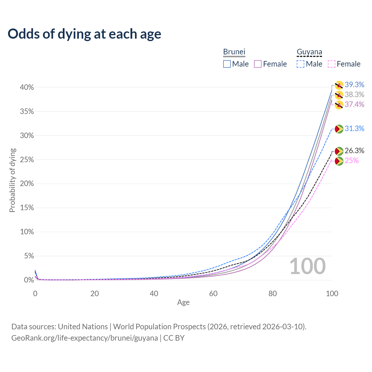 This life expectancy calculator shows the odds of living to 100, 95, 90, and below based on current age for both males and females in Brunei and Guyana, along with mean and median age of death. The calculations are based on the 2026 life tables (actuarial tables) from the UN World Population Prospects.