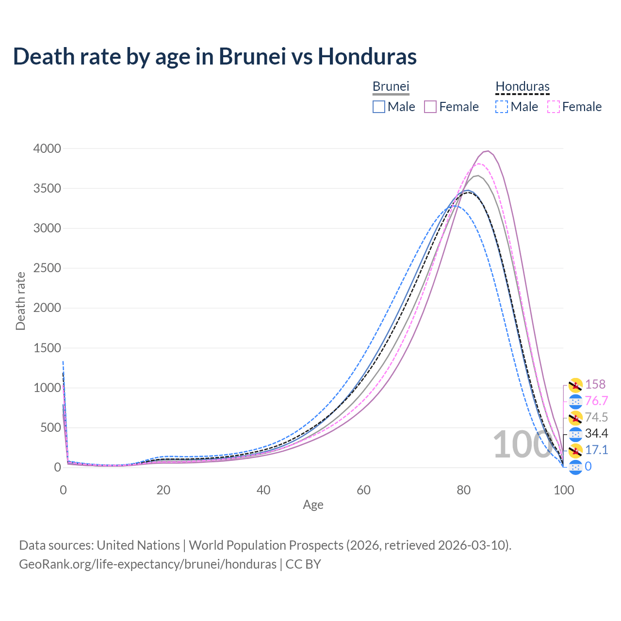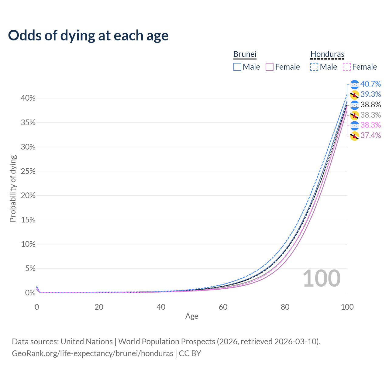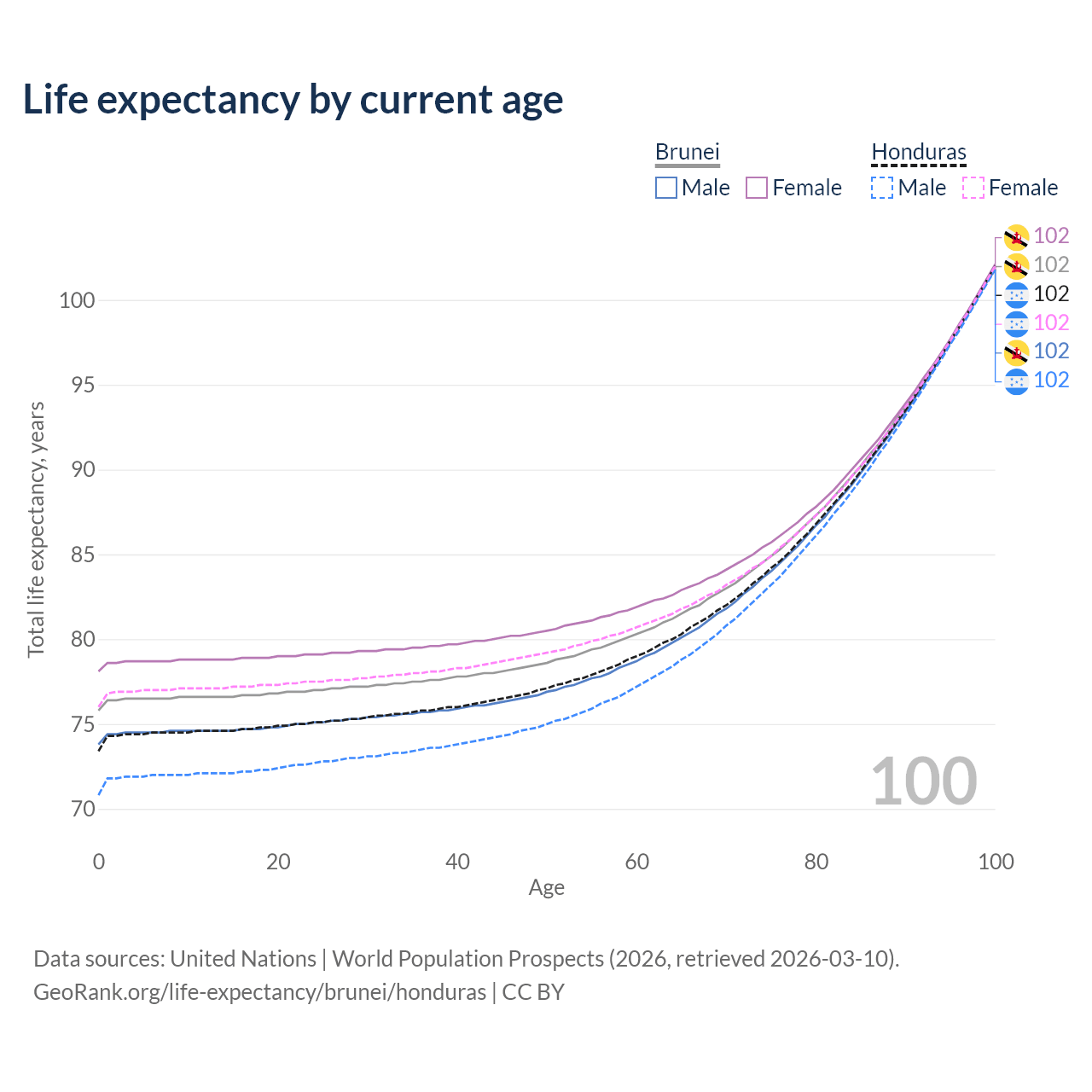 This life expectancy calculator shows the odds of living to 100, 95, 90, and below based on current age for both males and females in Brunei and Honduras, along with mean and median age of death. The calculations are based on the 2026 life tables (actuarial tables) from the UN World Population Prospects.