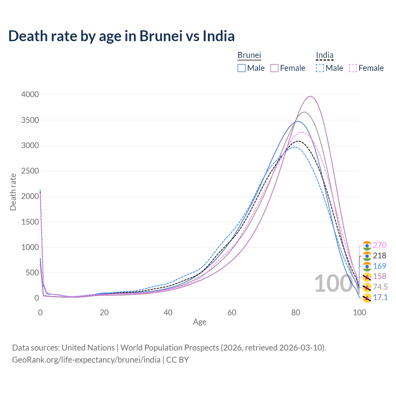 In Brunei, the most common age of death is 83, compared to 81 in India. The median age of death is 79.2 in Brunei and 76.8 in India, meaning only half of each cohort is expected to live past that age.