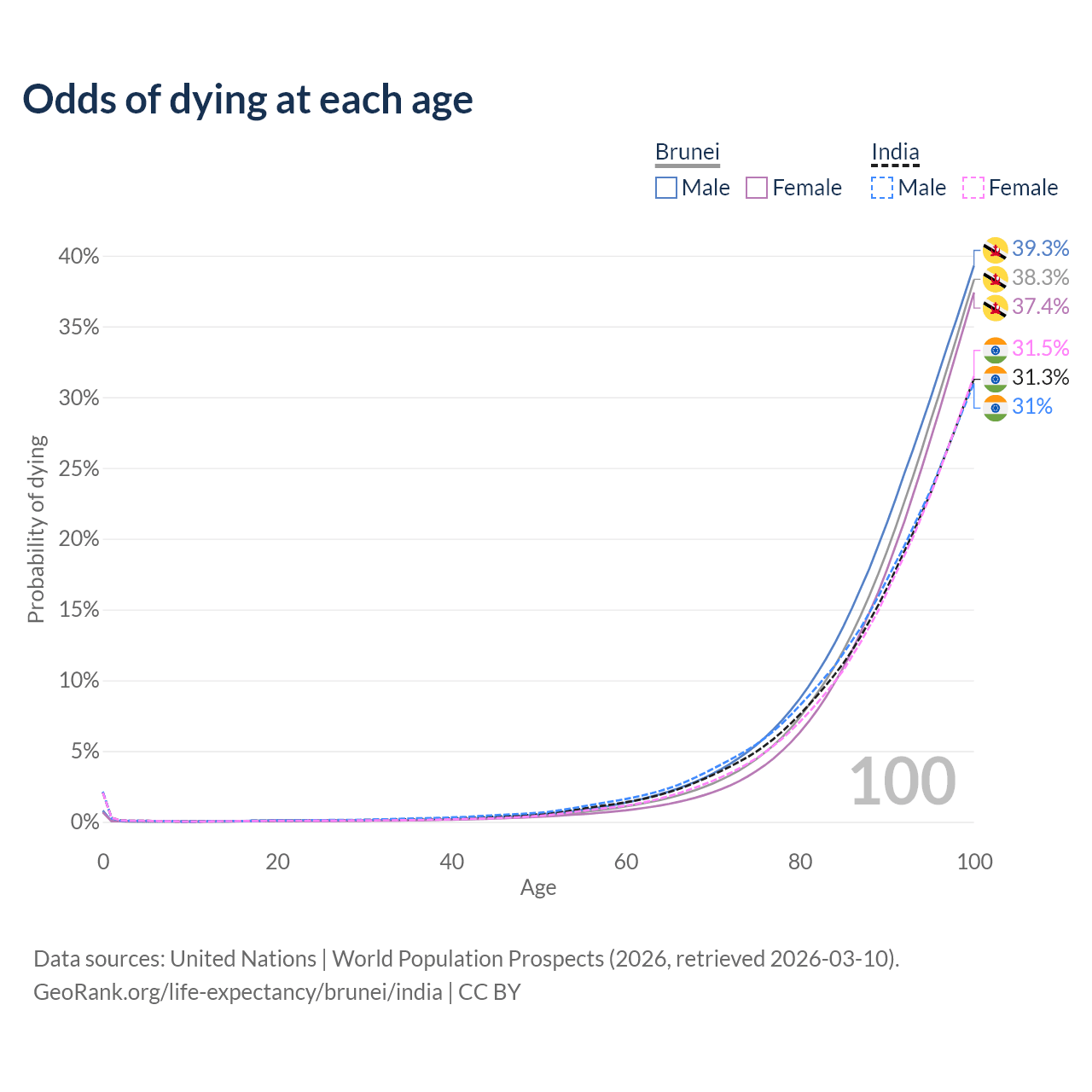 This life expectancy calculator shows the odds of living to 100, 95, 90, and below based on current age for both males and females in Brunei and India, along with mean and median age of death. The calculations are based on the 2026 life tables (actuarial tables) from the UN World Population Prospects.