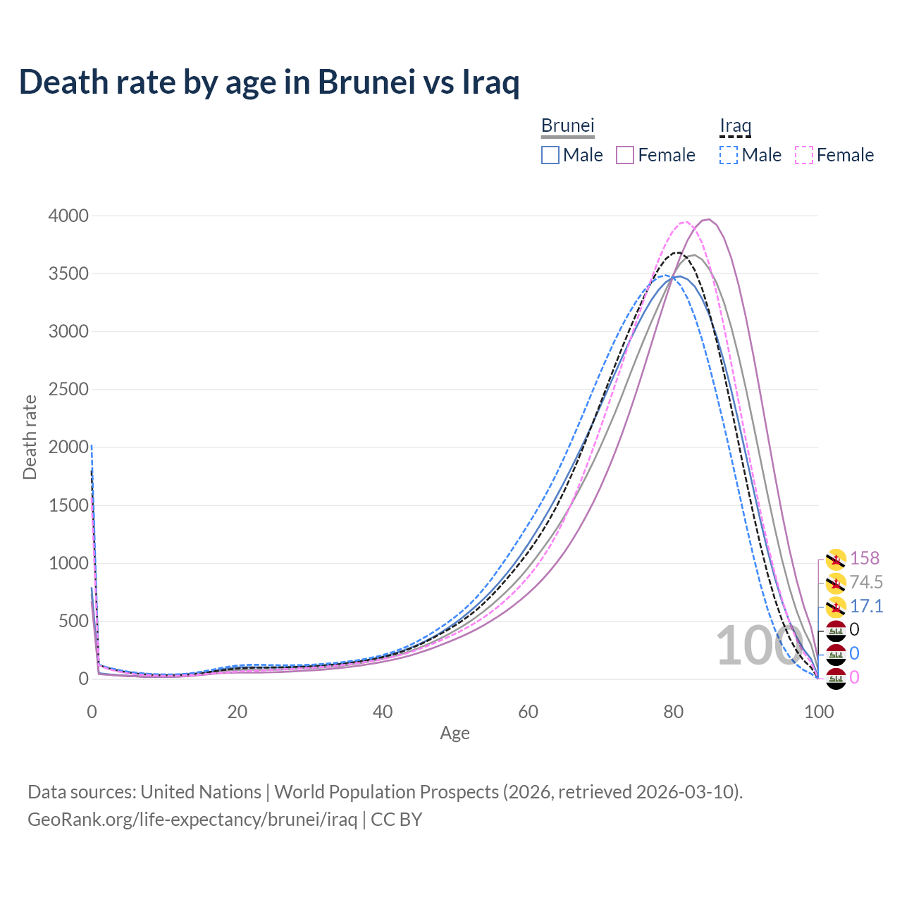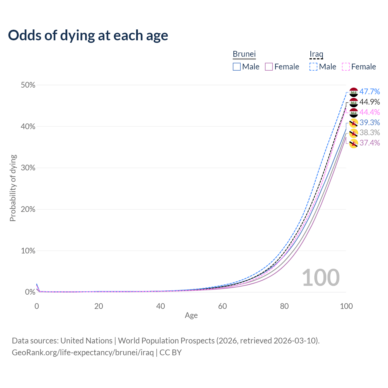 This life expectancy calculator shows the odds of living to 100, 95, 90, and below based on current age for both males and females in Brunei and Iraq, along with mean and median age of death. The calculations are based on the 2026 life tables (actuarial tables) from the UN World Population Prospects.