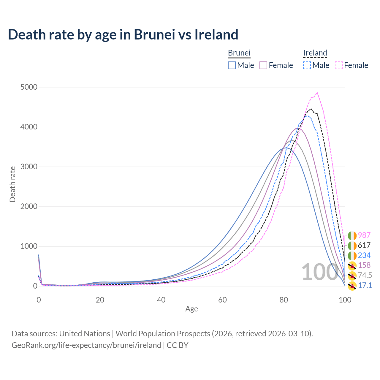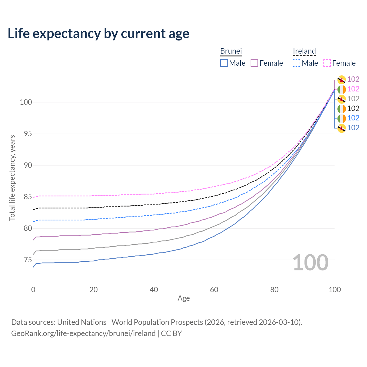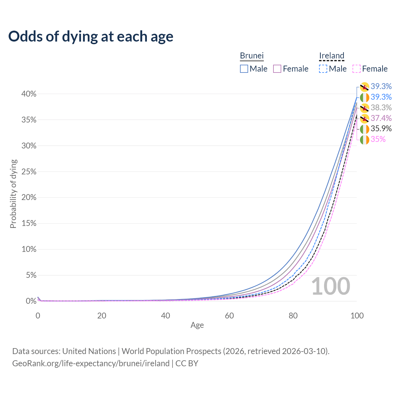 This life expectancy calculator shows the odds of living to 100, 95, 90, and below based on current age for both males and females in Brunei and Ireland, along with mean and median age of death. The calculations are based on the 2026 life tables (actuarial tables) from the UN World Population Prospects.