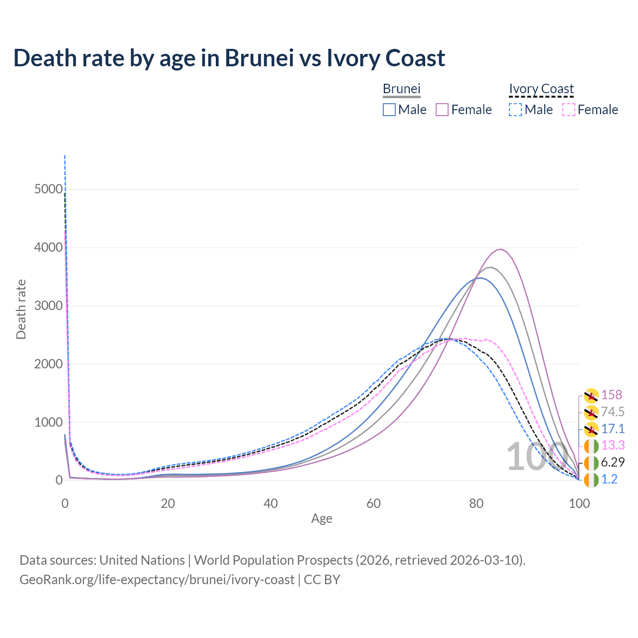 In Brunei, the most common age of death is 83, compared to 0 in Ivory Coast. The median age of death is 79.2 in Brunei and 68.6 in Ivory Coast, meaning only half of each cohort is expected to live past that age.