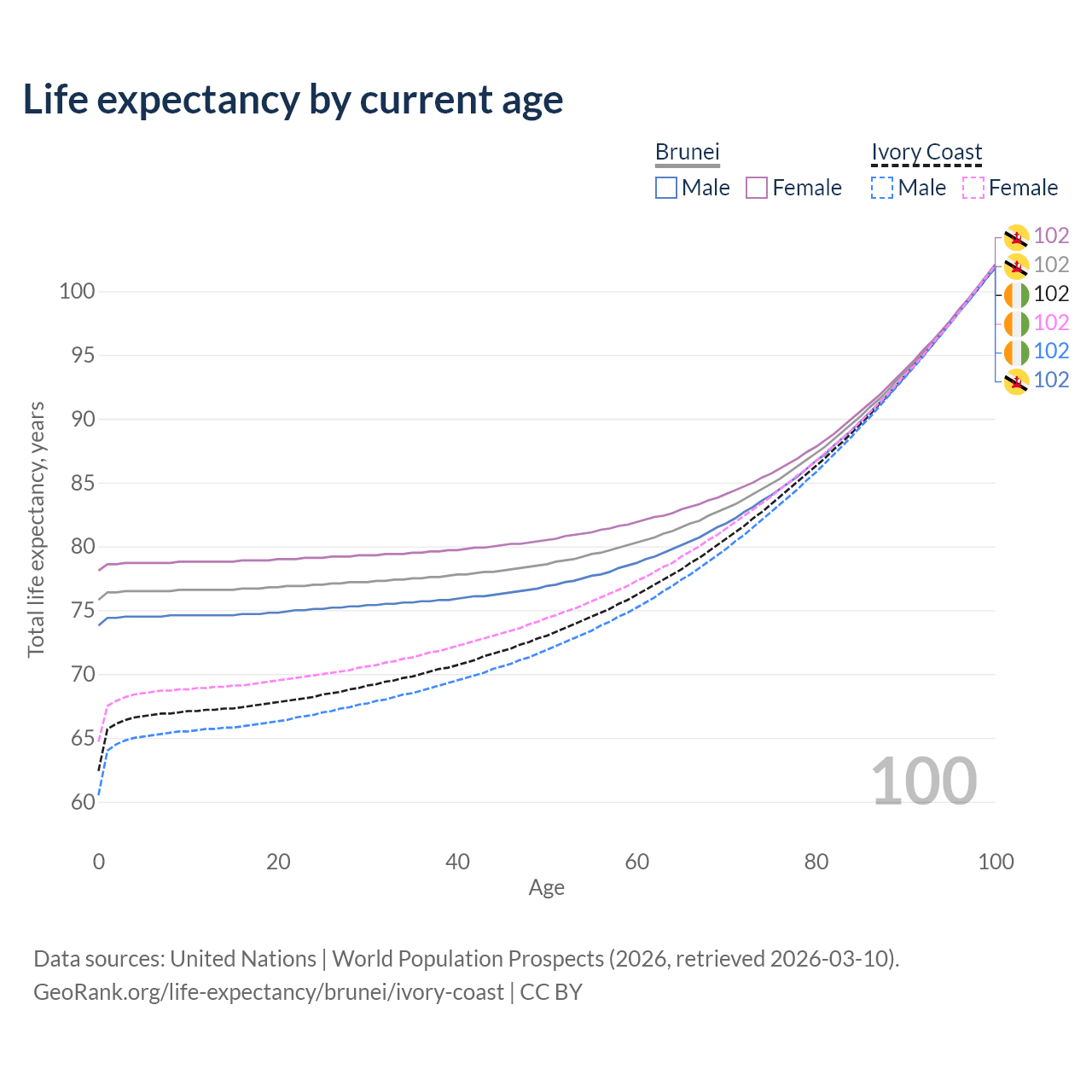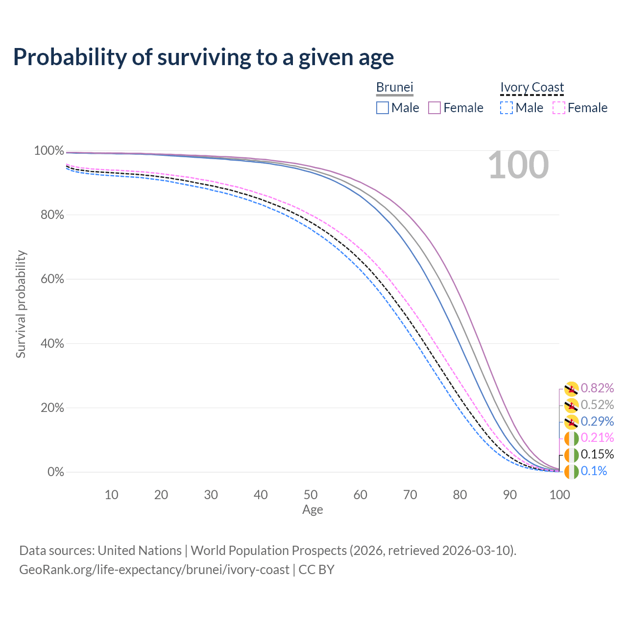 This life expectancy calculator shows the odds of living to 100, 95, 90, and below based on current age for both males and females in Brunei and Ivory Coast, along with mean and median age of death. The calculations are based on the 2026 life tables (actuarial tables) from the UN World Population Prospects.