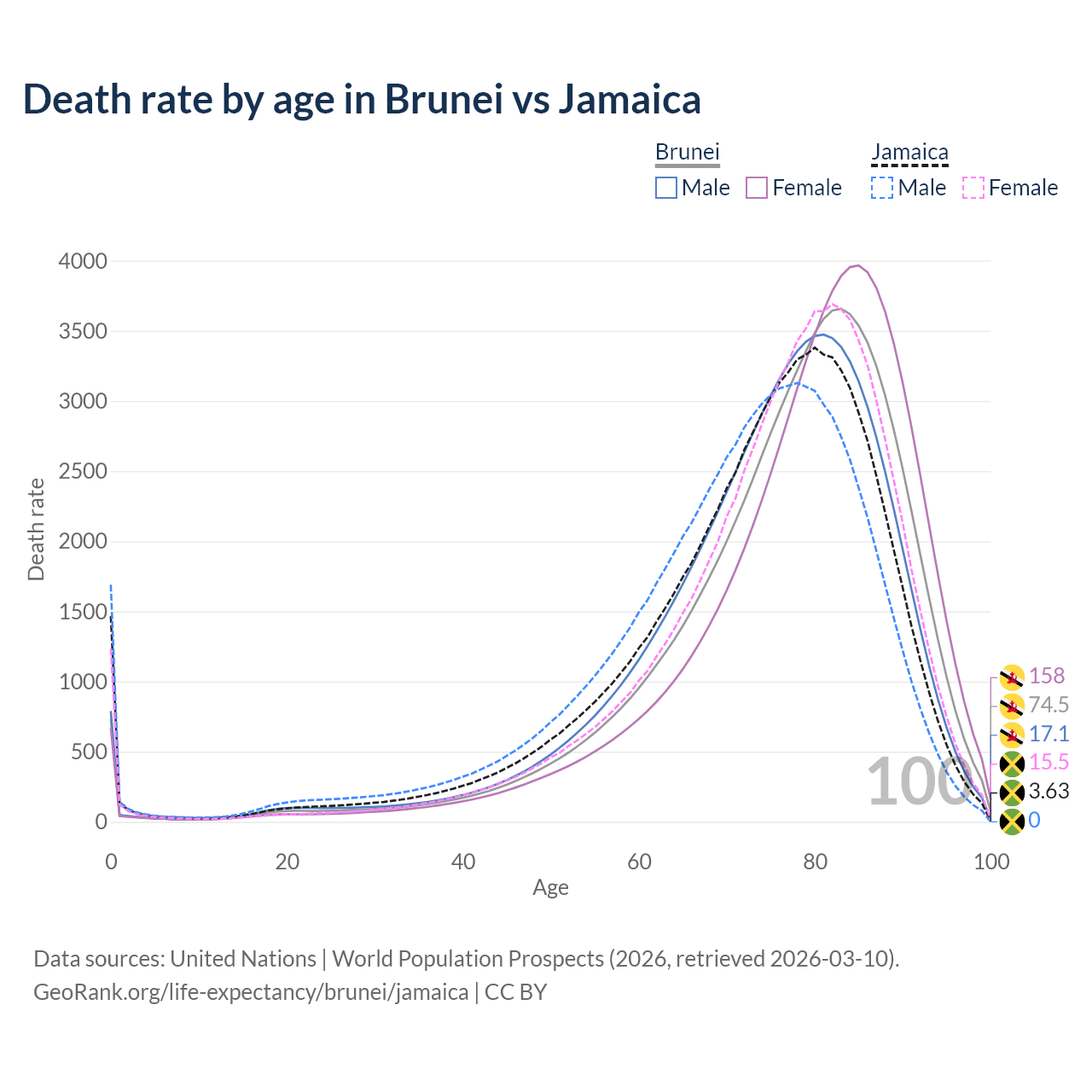In Brunei, the most common age of death is 83, compared to 80 in Jamaica. The median age of death is 79.2 in Brunei and 75.7 in Jamaica, meaning only half of each cohort is expected to live past that age.