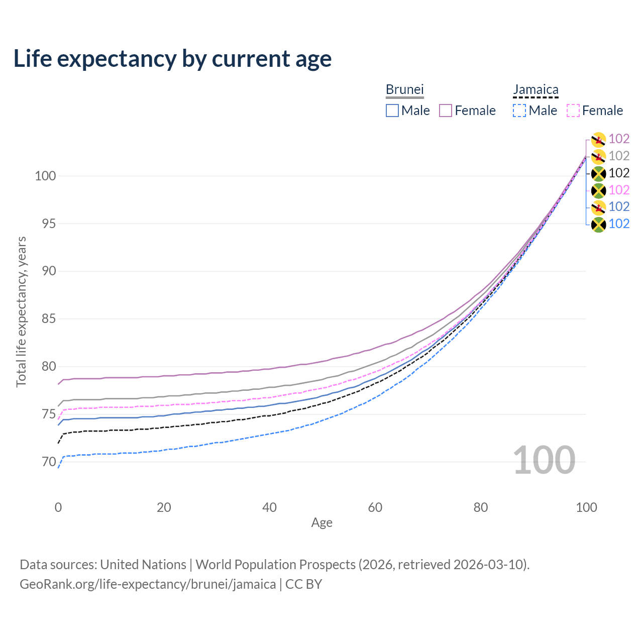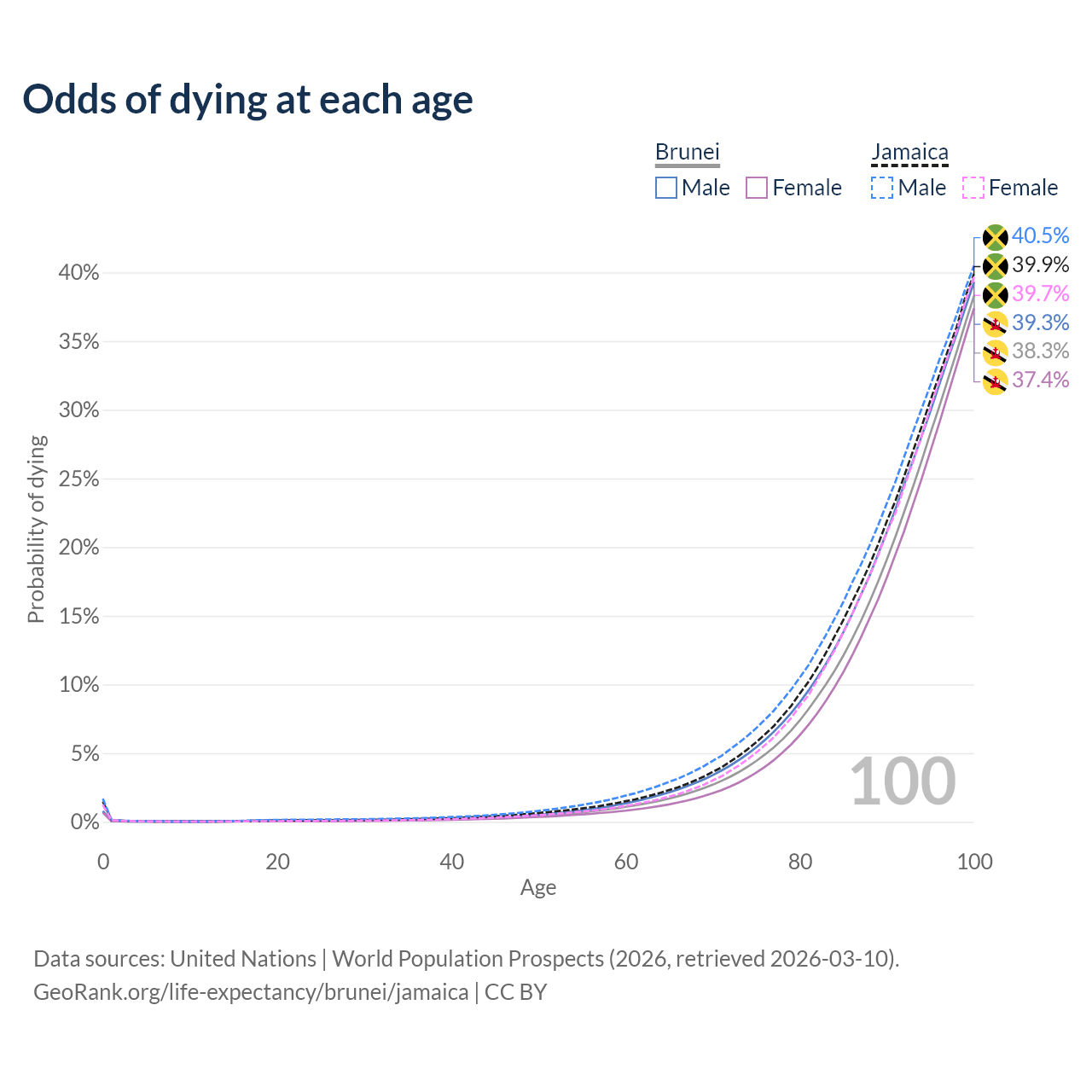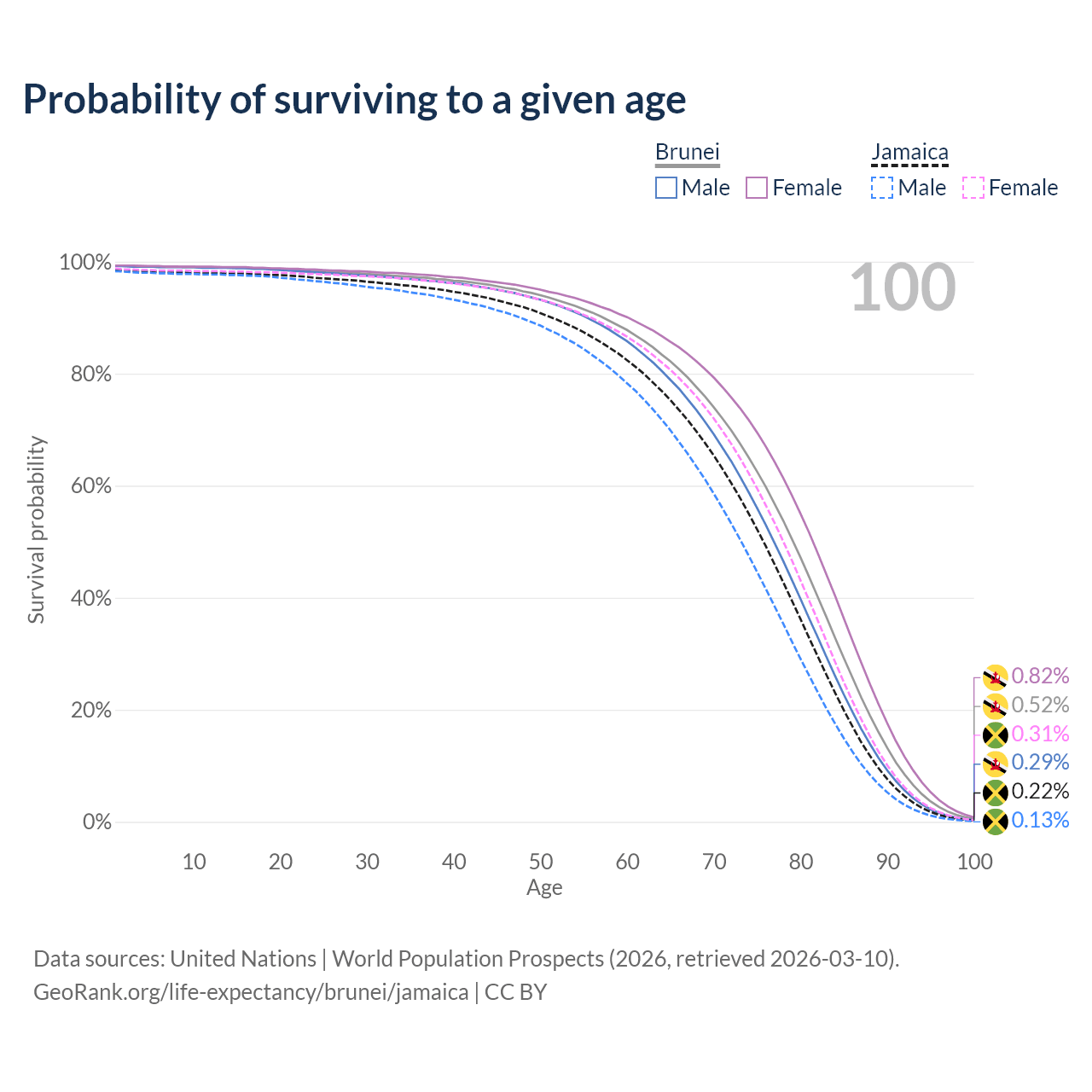 This life expectancy calculator shows the odds of living to 100, 95, 90, and below based on current age for both males and females in Brunei and Jamaica, along with mean and median age of death. The calculations are based on the 2026 life tables (actuarial tables) from the UN World Population Prospects.