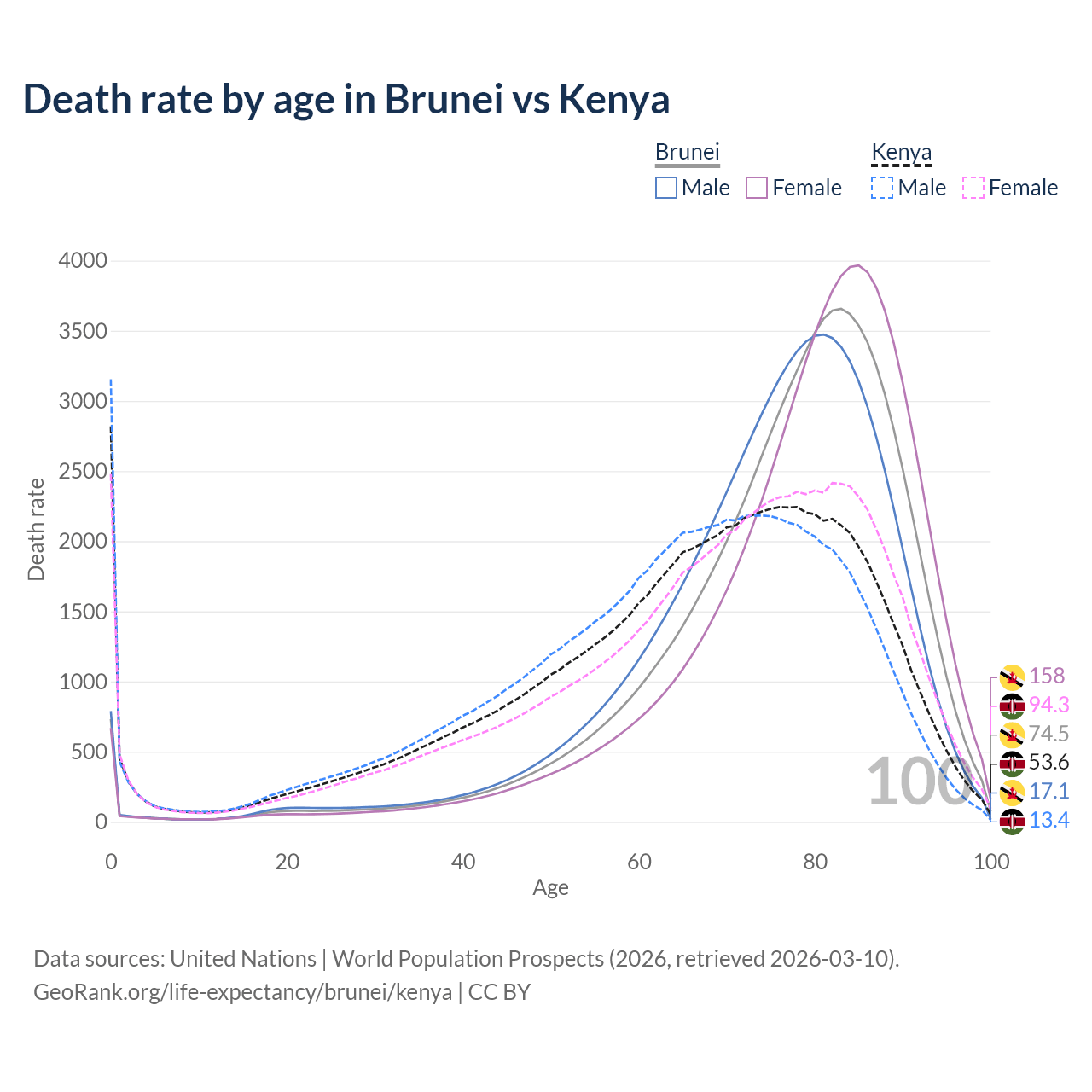 The average life expectancy at birth is 75.8 years in Brunei vs 64.2 in Kenya. Brunei is ranked 86/197 by life expectancy, and Kenya is 177/197. In Brunei, the life expectancy is 73.8 years for males and 78.1 years for females. In Kenya, it's 62 years for males and 66.5 years for females.
