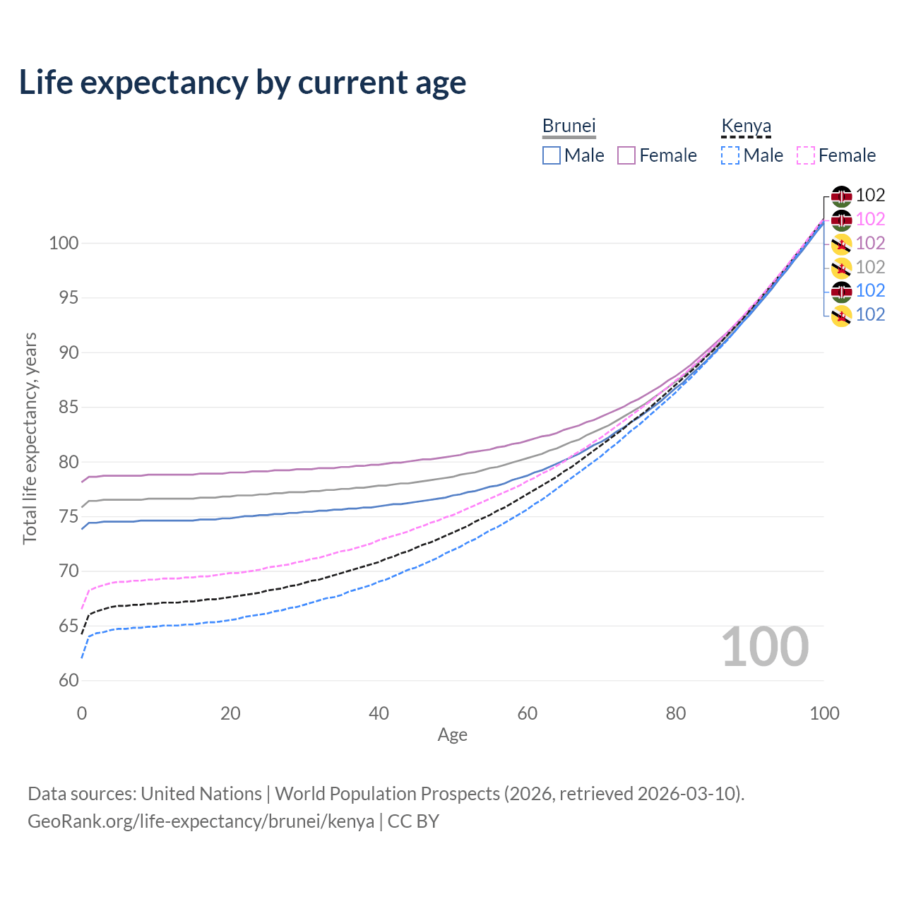 This life expectancy calculator shows the odds of living to 100, 95, 90, and below based on current age for both males and females in Brunei and Kenya, along with mean and median age of death. The calculations are based on the 2026 life tables (actuarial tables) from the UN World Population Prospects.