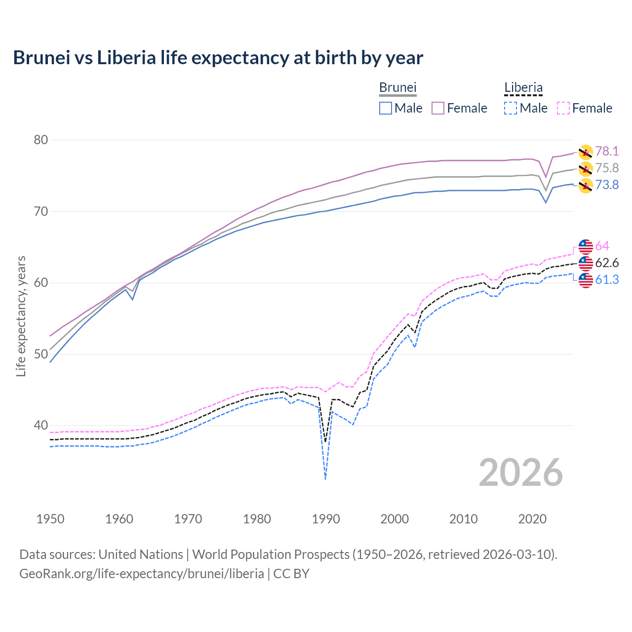 The average life expectancy at birth is 75.8 years in Brunei vs 62.6 in Liberia. Brunei is ranked 86/197 by life expectancy, and Liberia is 182/197. In Brunei, the life expectancy is 73.8 years for males and 78.1 years for females. In Liberia, it's 61.3 years for males and 64 years for females.