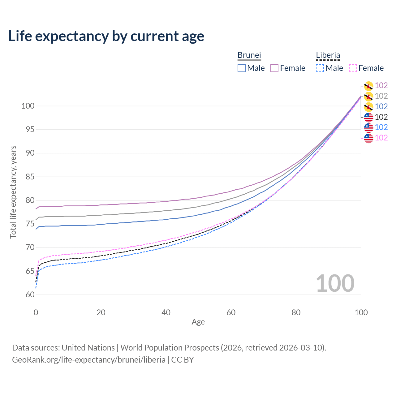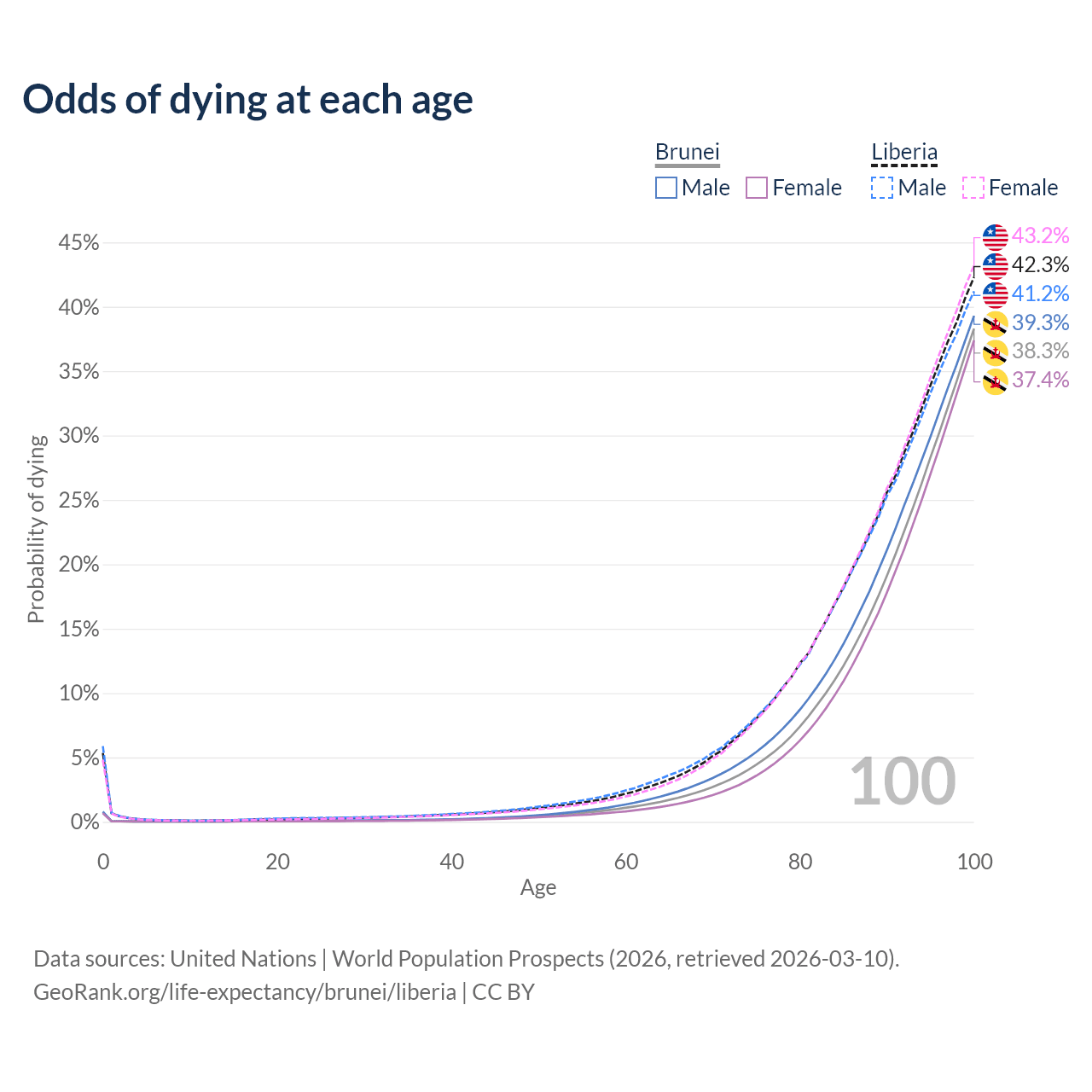 This life expectancy calculator shows the odds of living to 100, 95, 90, and below based on current age for both males and females in Brunei and Liberia, along with mean and median age of death. The calculations are based on the 2026 life tables (actuarial tables) from the UN World Population Prospects.