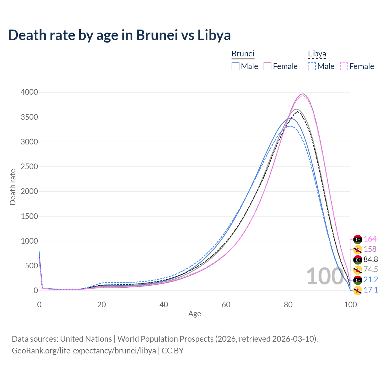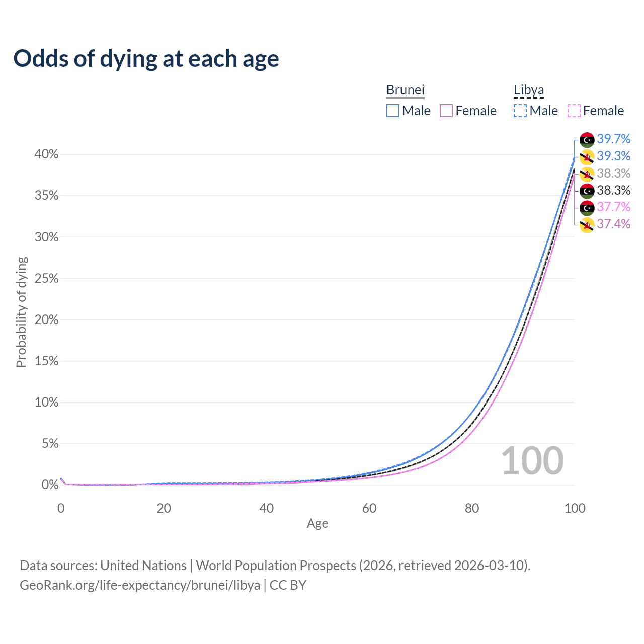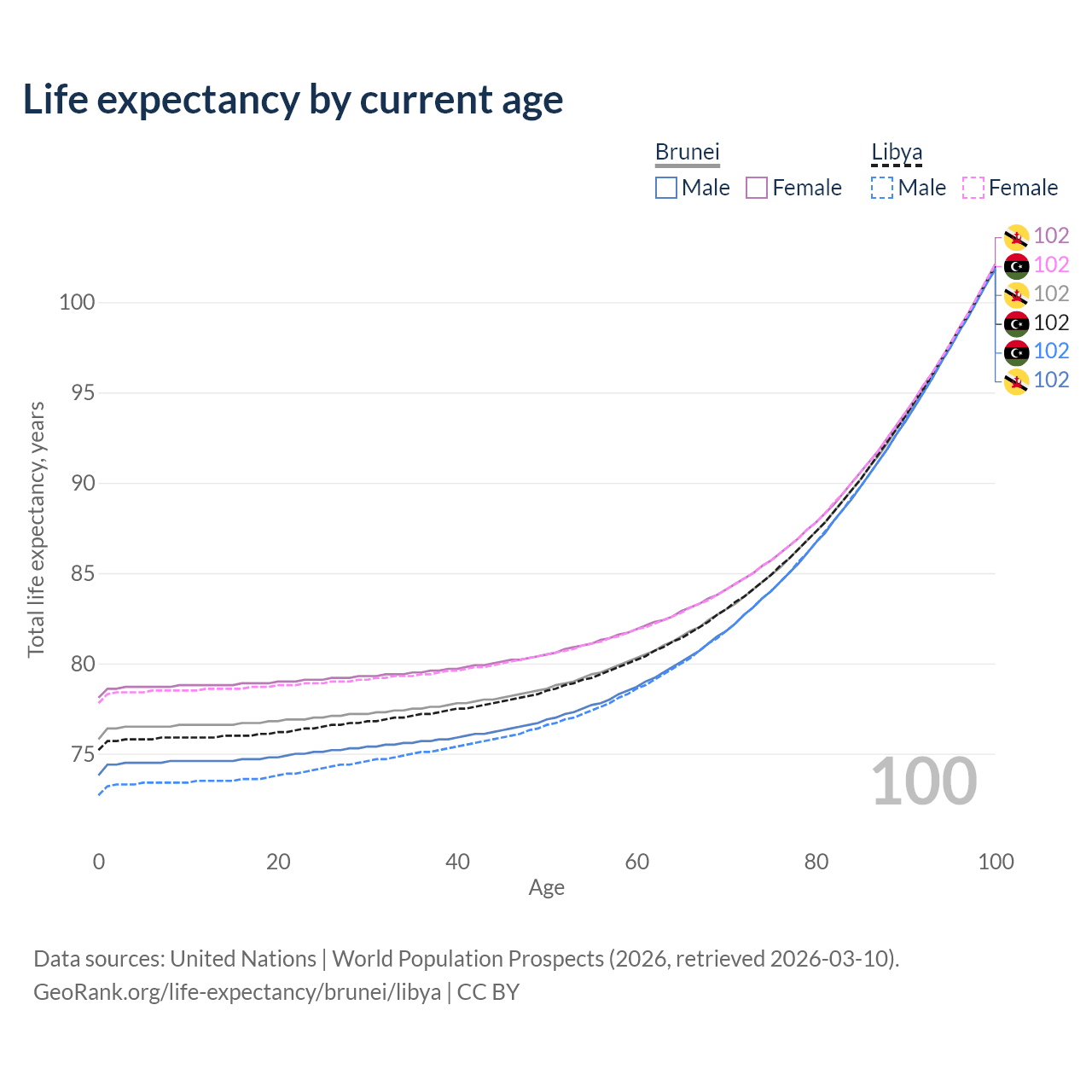 This life expectancy calculator shows the odds of living to 100, 95, 90, and below based on current age for both males and females in Brunei and Libya, along with mean and median age of death. The calculations are based on the 2026 life tables (actuarial tables) from the UN World Population Prospects.
