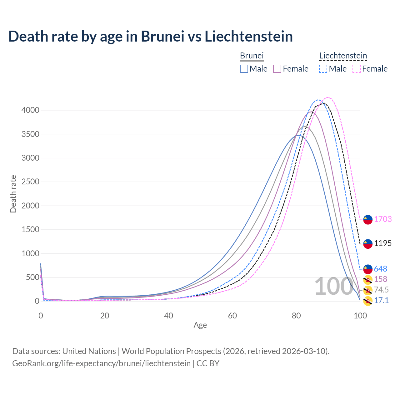 In Brunei, the most common age of death is 83, compared to 89 in Liechtenstein. The median age of death is 79.2 in Brunei and 86.3 in Liechtenstein, meaning only half of each cohort is expected to live past that age.