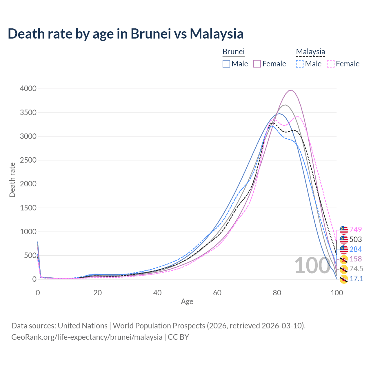 This life expectancy calculator shows the odds of living to 100, 95, 90, and below based on current age for both males and females in Brunei and Malaysia, along with mean and median age of death. The calculations are based on the 2026 life tables (actuarial tables) from the UN World Population Prospects.