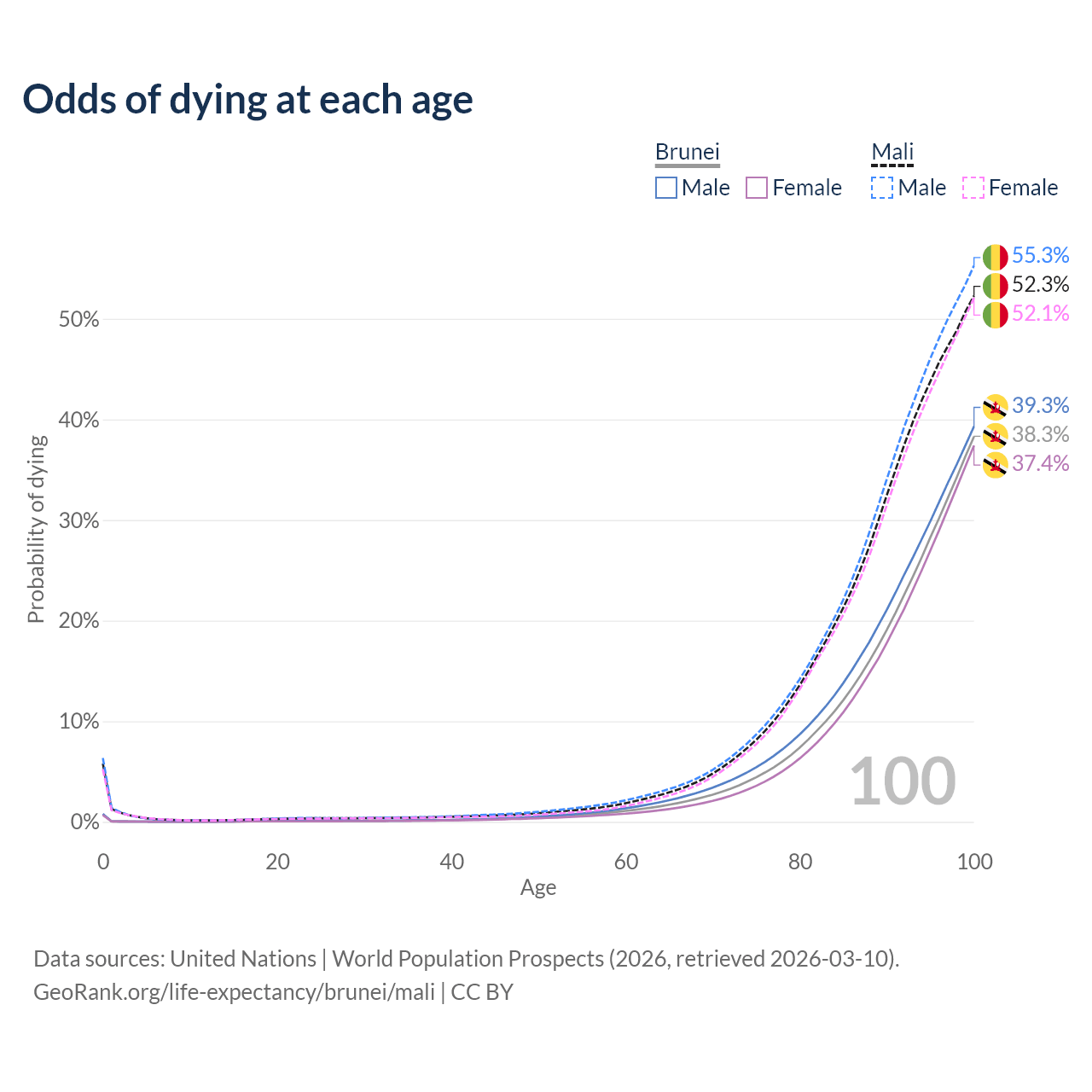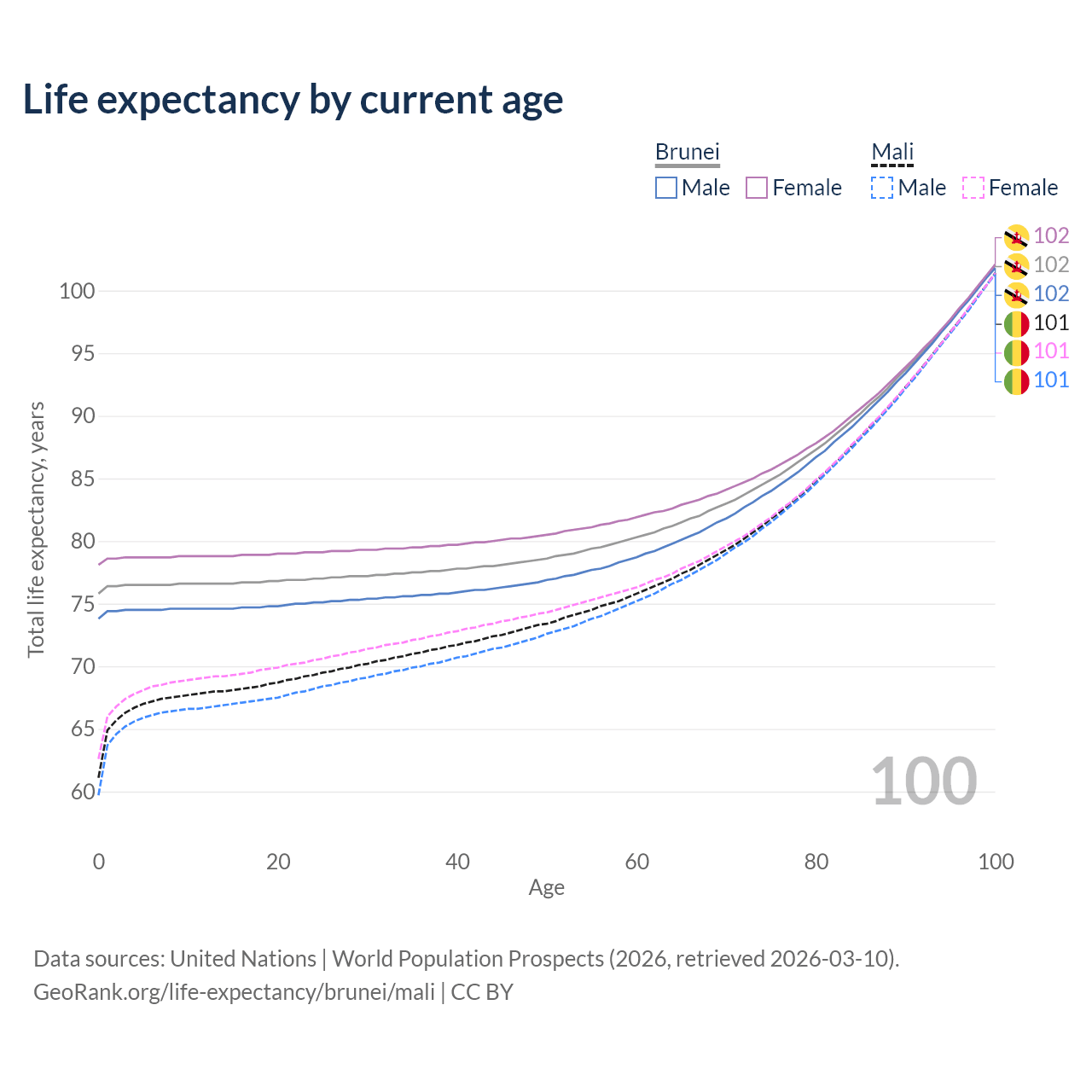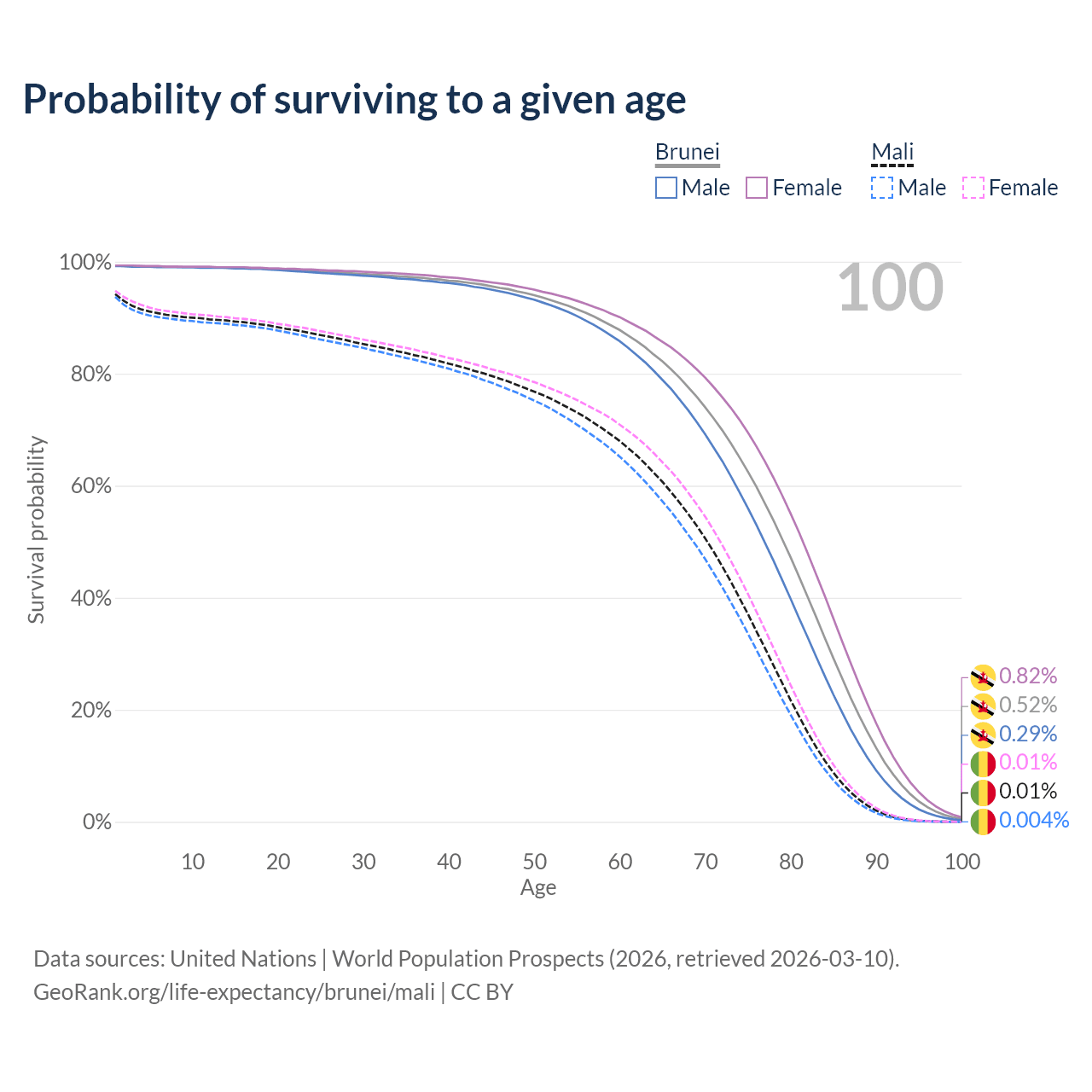 This life expectancy calculator shows the odds of living to 100, 95, 90, and below based on current age for both males and females in Brunei and Mali, along with mean and median age of death. The calculations are based on the 2026 life tables (actuarial tables) from the UN World Population Prospects.