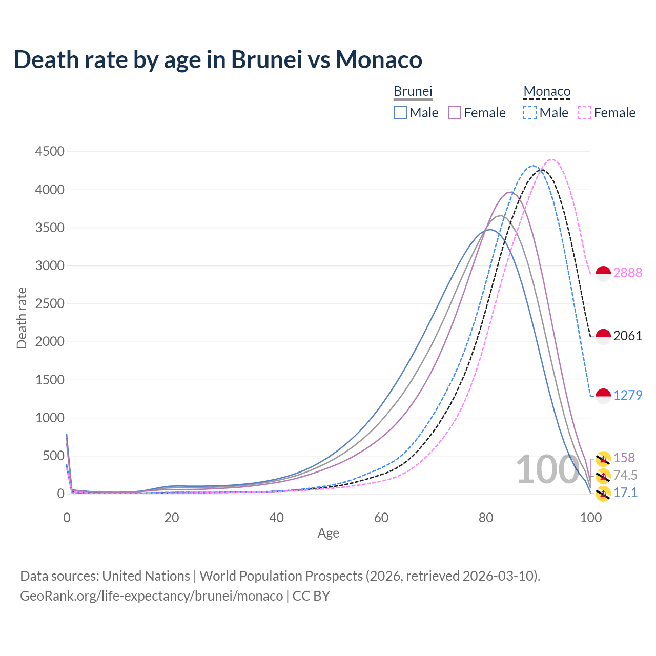 This life expectancy calculator shows the odds of living to 100, 95, 90, and below based on current age for both males and females in Brunei and Monaco, along with mean and median age of death. The calculations are based on the 2026 life tables (actuarial tables) from the UN World Population Prospects.