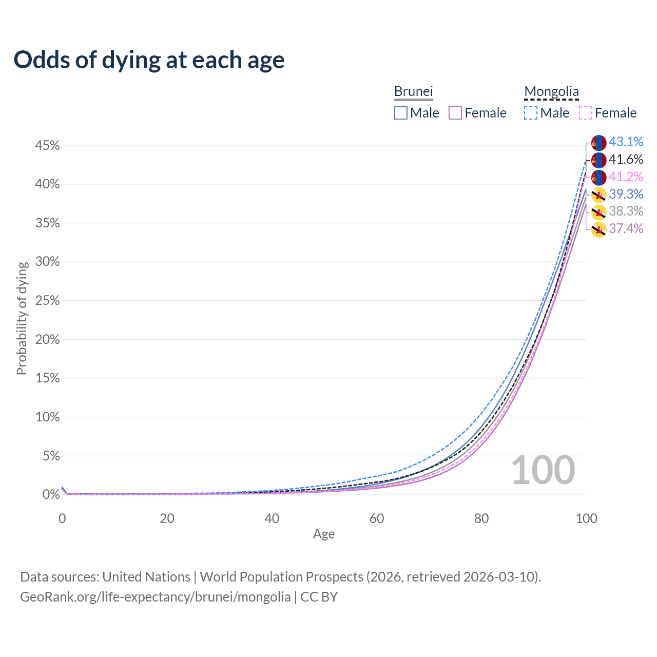 This life expectancy calculator shows the odds of living to 100, 95, 90, and below based on current age for both males and females in Brunei and Mongolia, along with mean and median age of death. The calculations are based on the 2026 life tables (actuarial tables) from the UN World Population Prospects.
