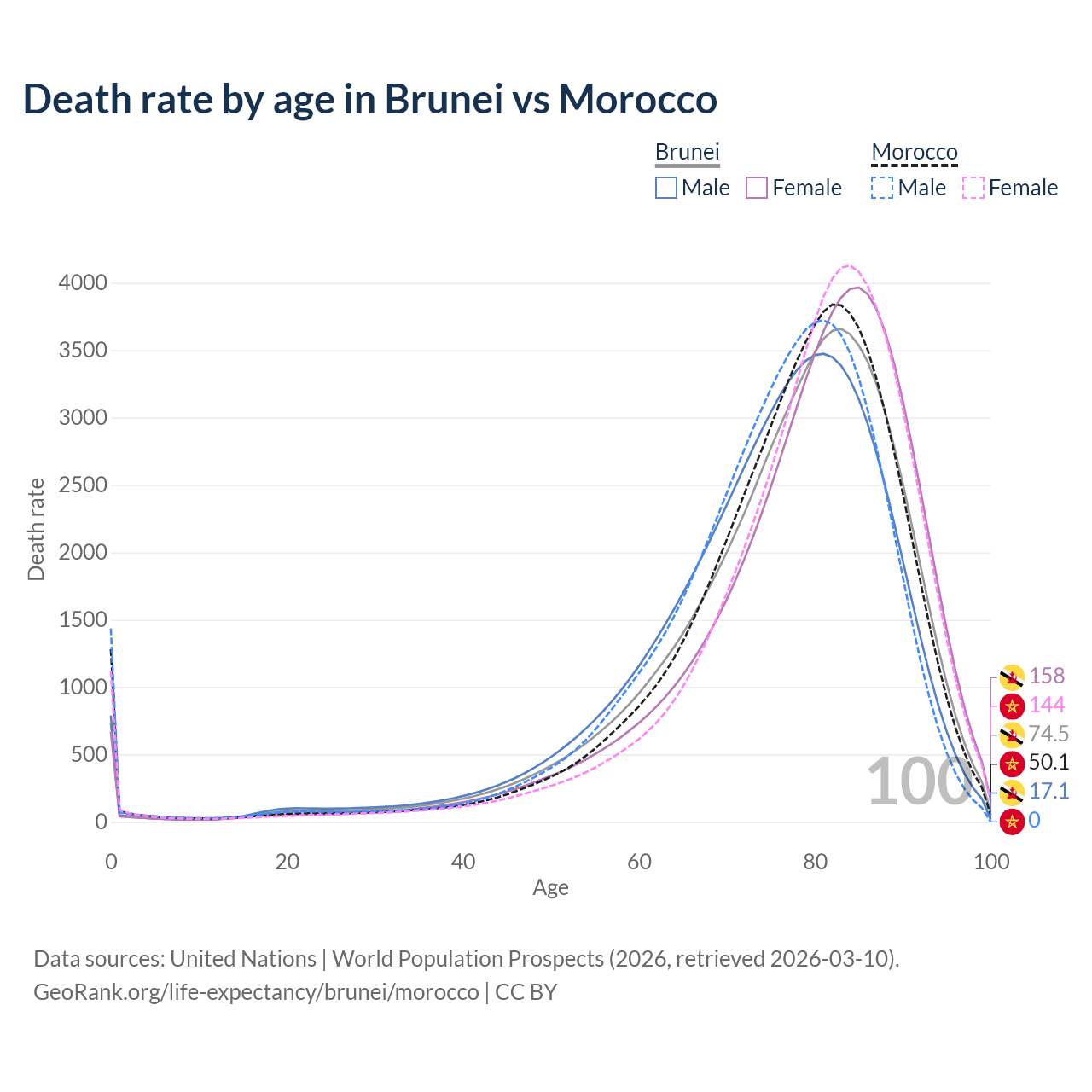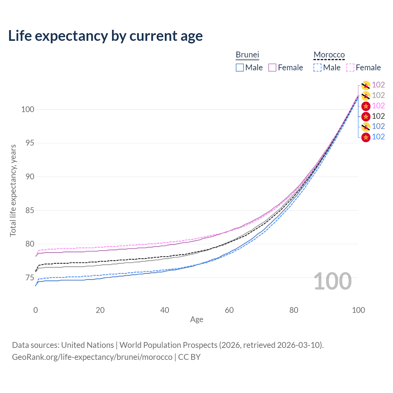 This life expectancy calculator shows the odds of living to 100, 95, 90, and below based on current age for both males and females in Brunei and Morocco, along with mean and median age of death. The calculations are based on the 2026 life tables (actuarial tables) from the UN World Population Prospects.