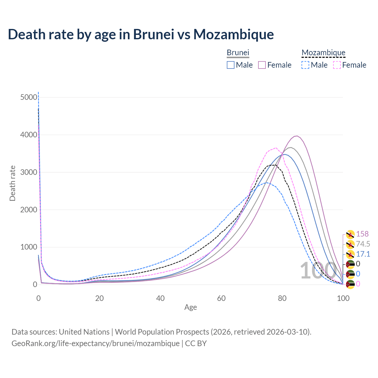 In Brunei, the most common age of death is 83, compared to 0 in Mozambique. The median age of death is 79.2 in Brunei and 71.2 in Mozambique, meaning only half of each cohort is expected to live past that age.