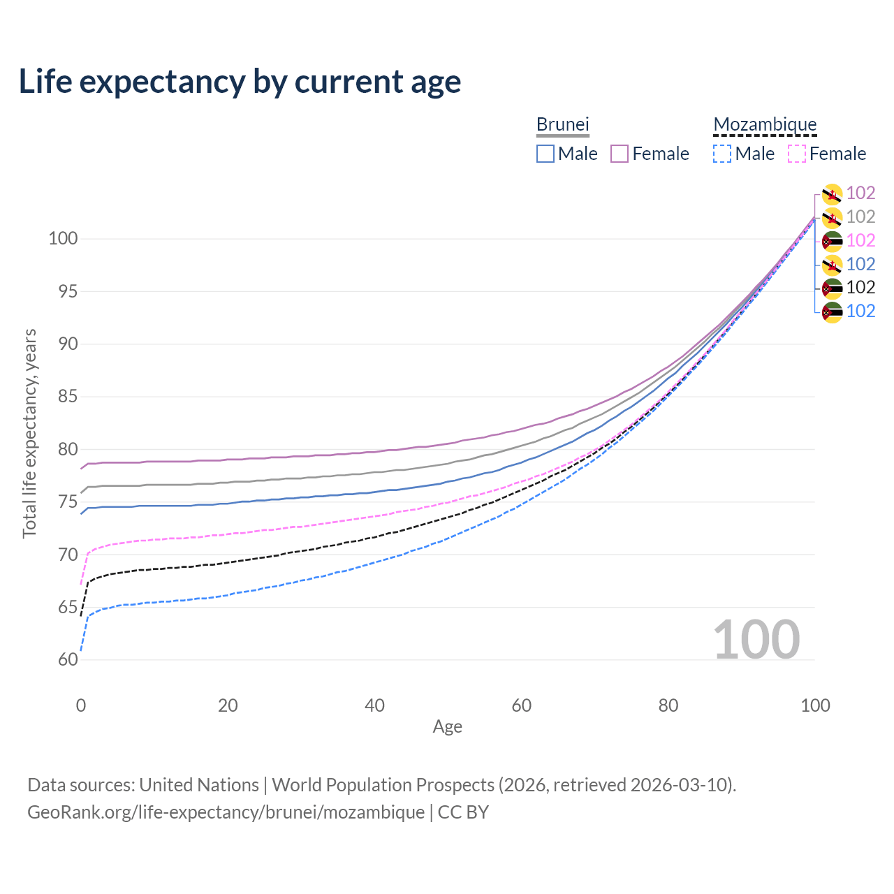 This life expectancy calculator shows the odds of living to 100, 95, 90, and below based on current age for both males and females in Brunei and Mozambique, along with mean and median age of death. The calculations are based on the 2026 life tables (actuarial tables) from the UN World Population Prospects.