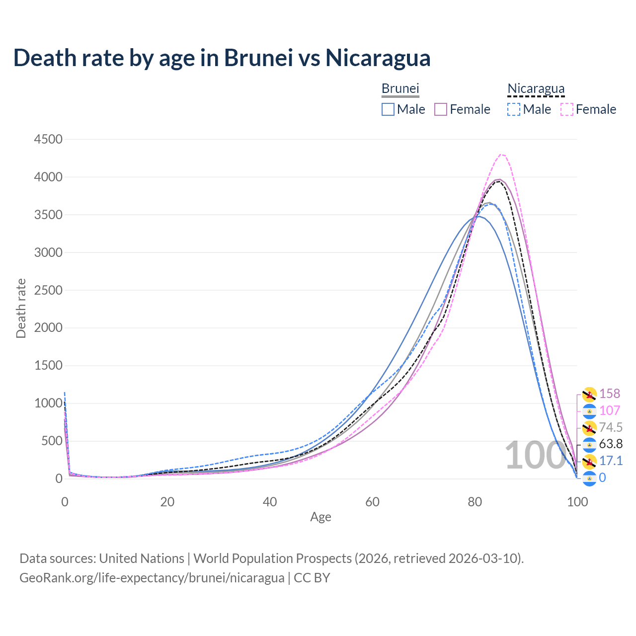 In Brunei, the most common age of death is 83, compared to 85 in Nicaragua. The median age of death is 79.2 in Brunei and 79.9 in Nicaragua, meaning only half of each cohort is expected to live past that age.