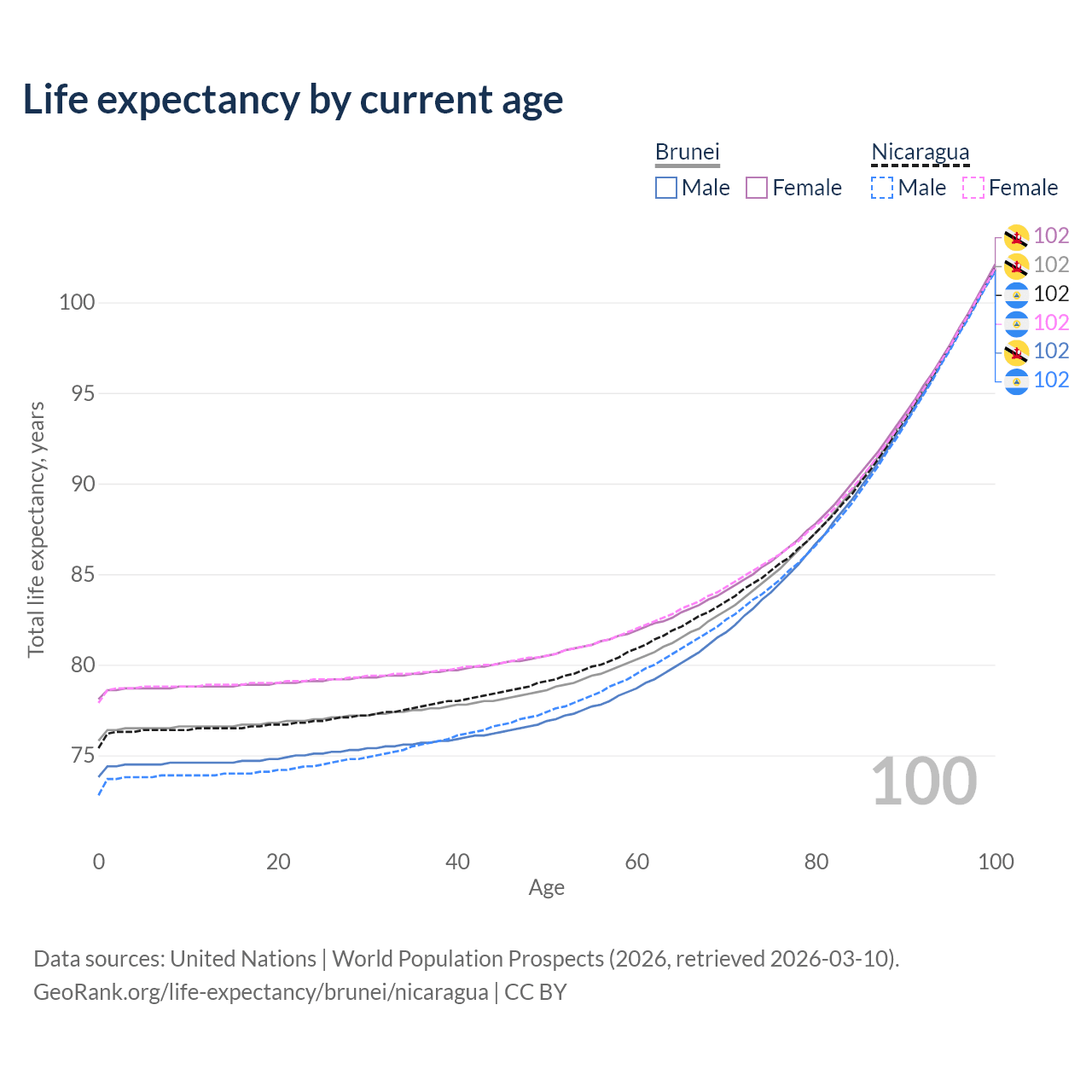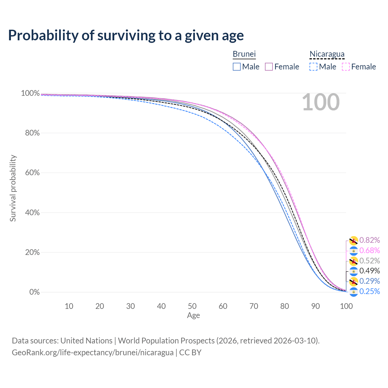 This life expectancy calculator shows the odds of living to 100, 95, 90, and below based on current age for both males and females in Brunei and Nicaragua, along with mean and median age of death. The calculations are based on the 2026 life tables (actuarial tables) from the UN World Population Prospects.