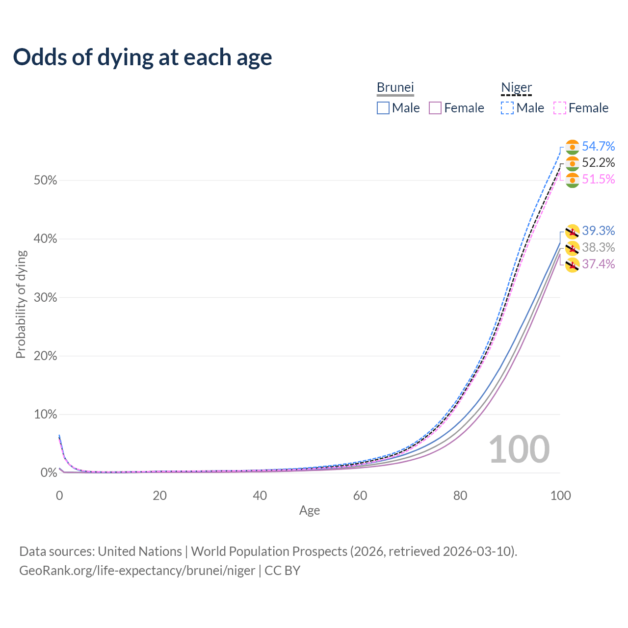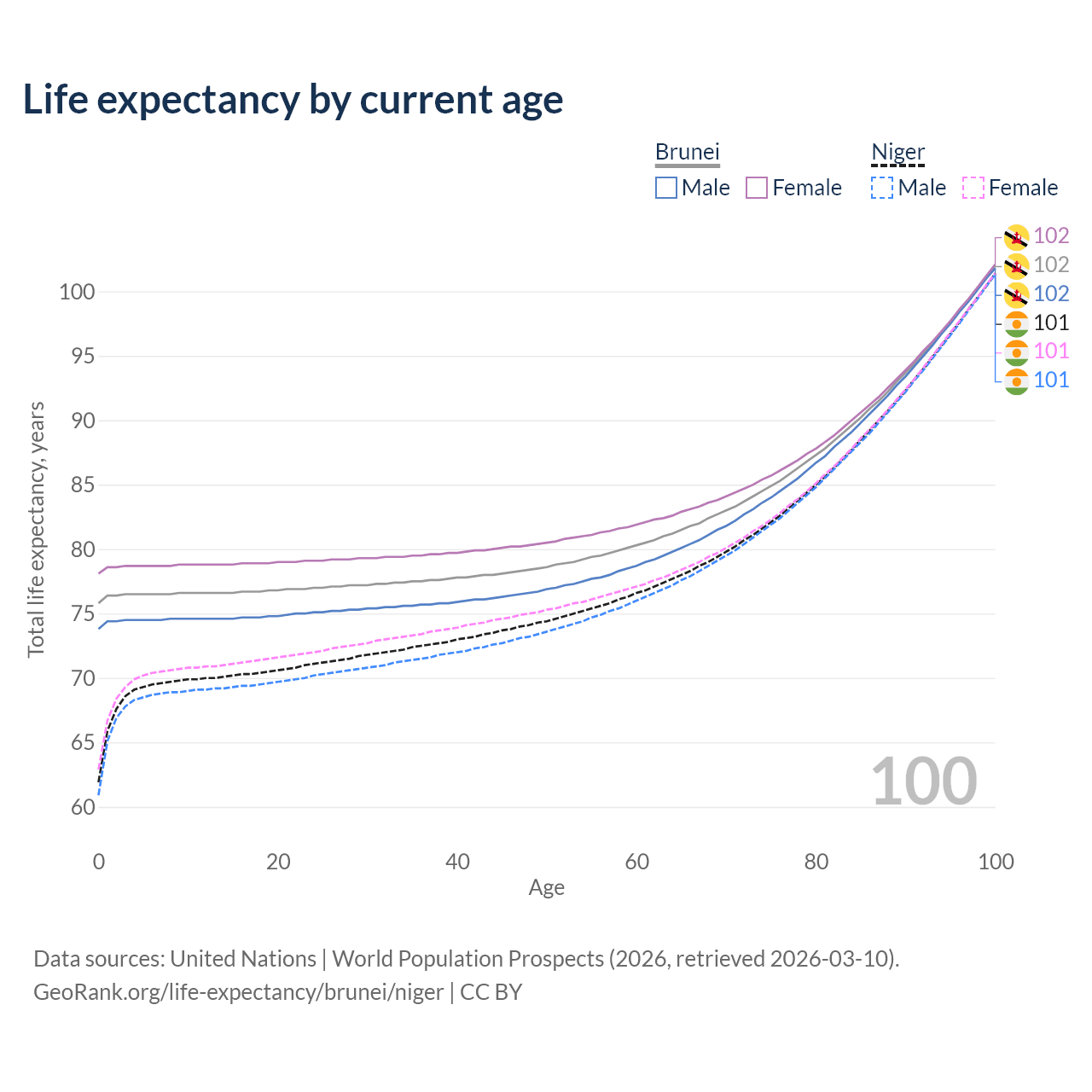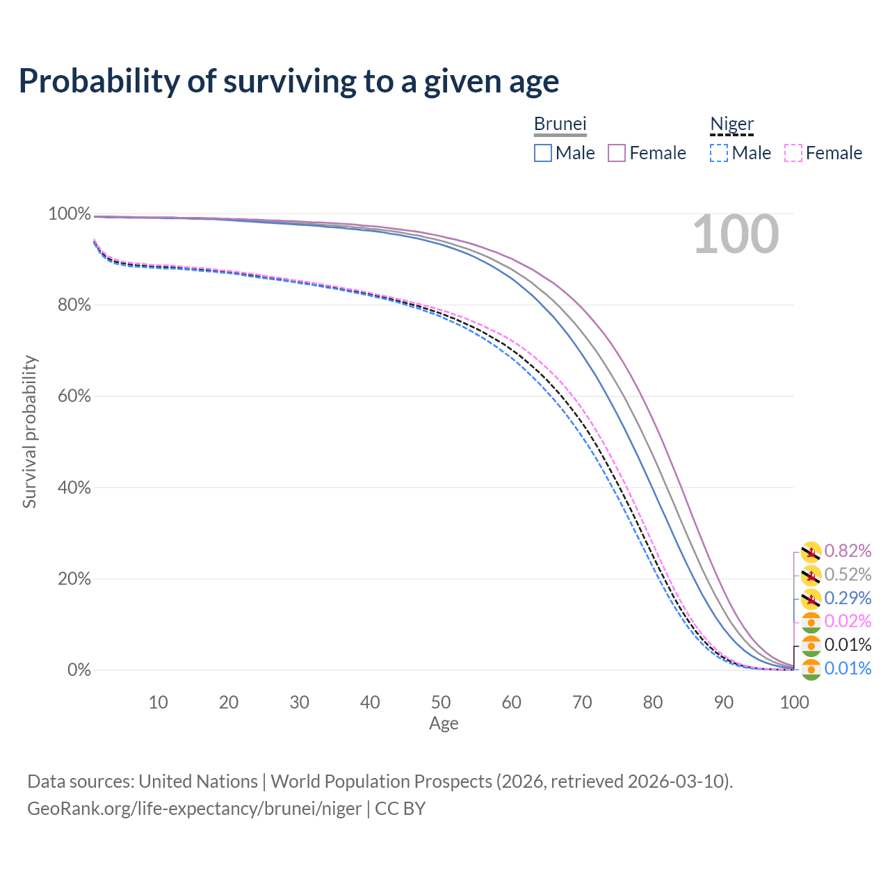 This life expectancy calculator shows the odds of living to 100, 95, 90, and below based on current age for both males and females in Brunei and Niger, along with mean and median age of death. The calculations are based on the 2026 life tables (actuarial tables) from the UN World Population Prospects.
