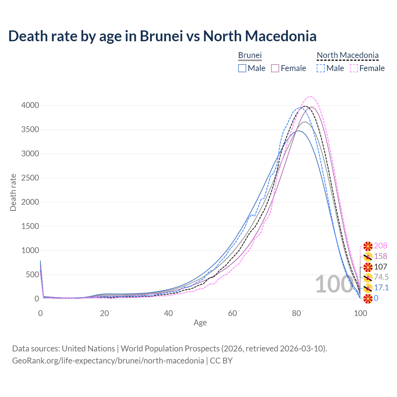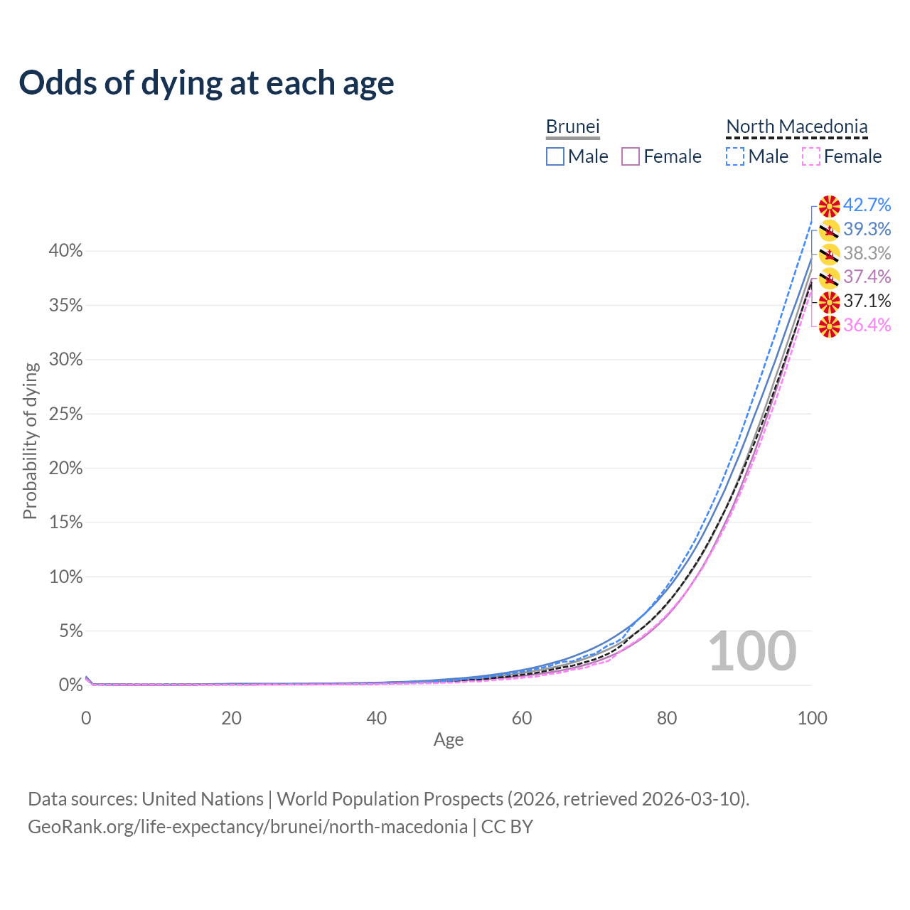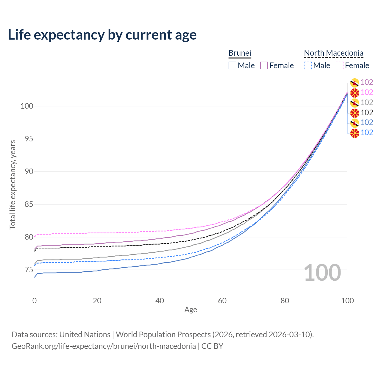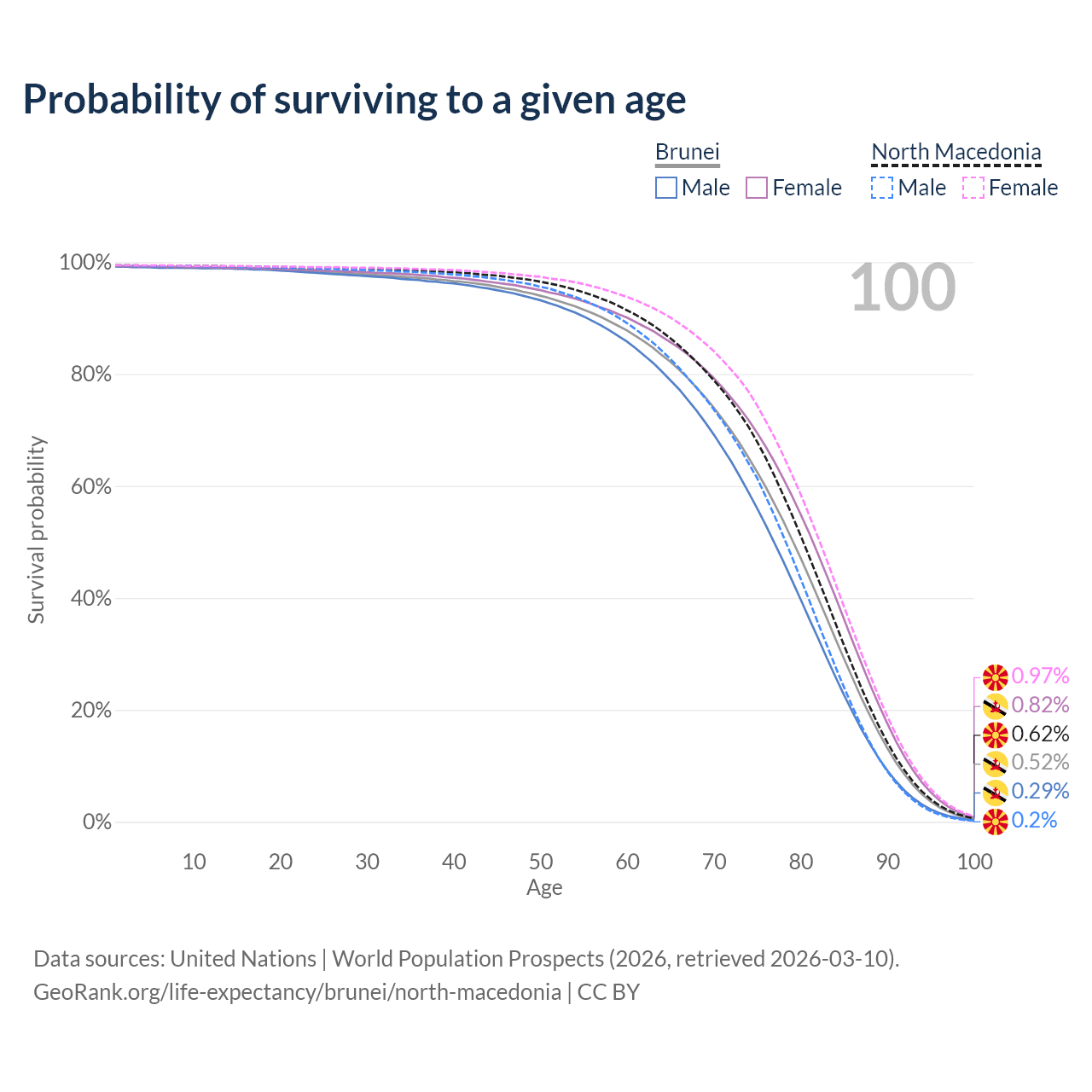This life expectancy calculator shows the odds of living to 100, 95, 90, and below based on current age for both males and females in Brunei and North Macedonia, along with mean and median age of death. The calculations are based on the 2026 life tables (actuarial tables) from the UN World Population Prospects.