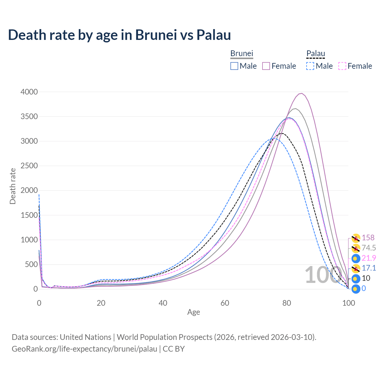 In Brunei, the most common age of death is 83, compared to 78 in Palau. The median age of death is 79.2 in Brunei and 73.8 in Palau, meaning only half of each cohort is expected to live past that age.