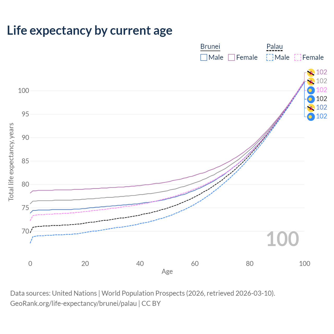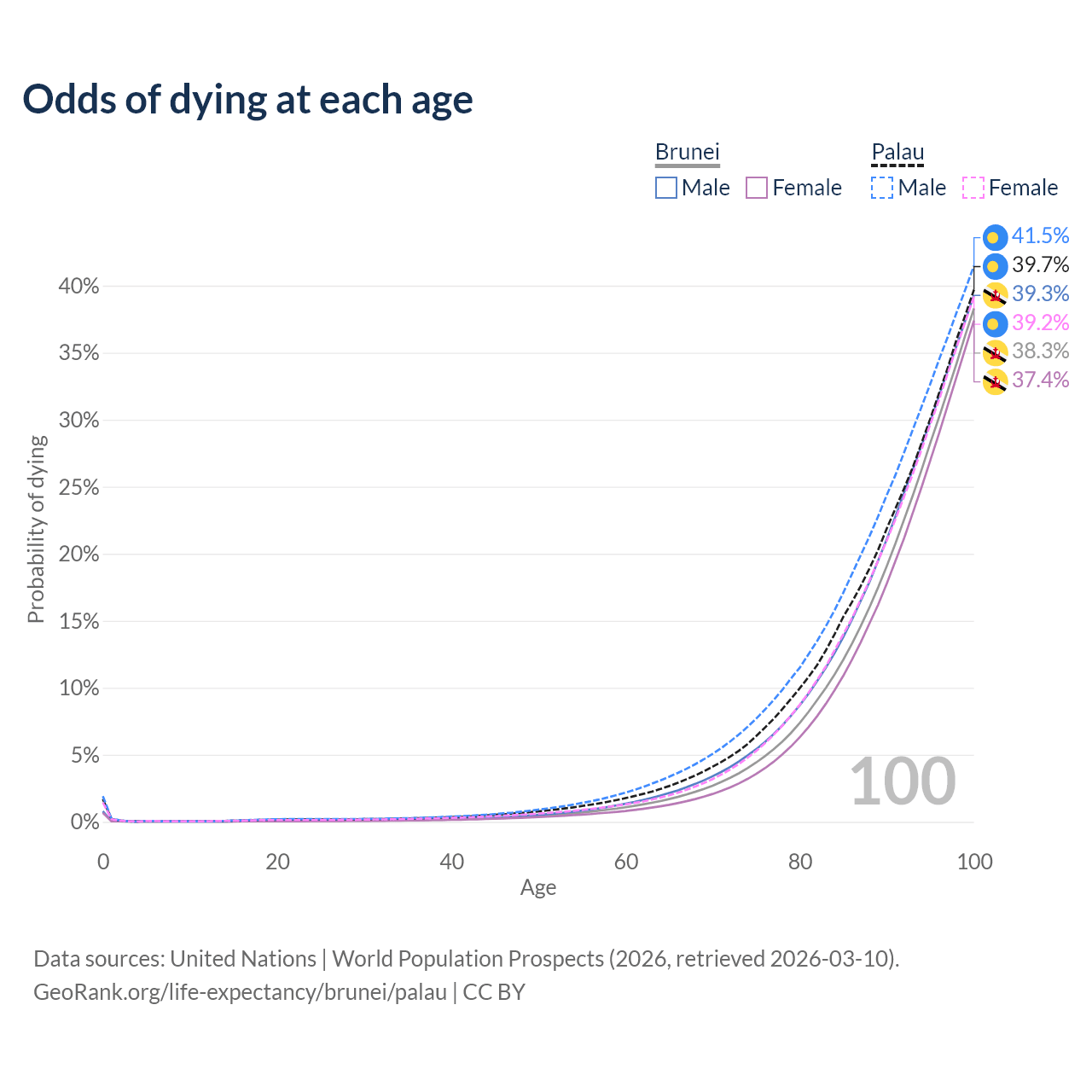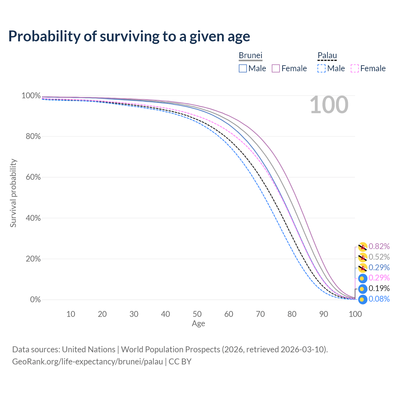 This life expectancy calculator shows the odds of living to 100, 95, 90, and below based on current age for both males and females in Brunei and Palau, along with mean and median age of death. The calculations are based on the 2026 life tables (actuarial tables) from the UN World Population Prospects.