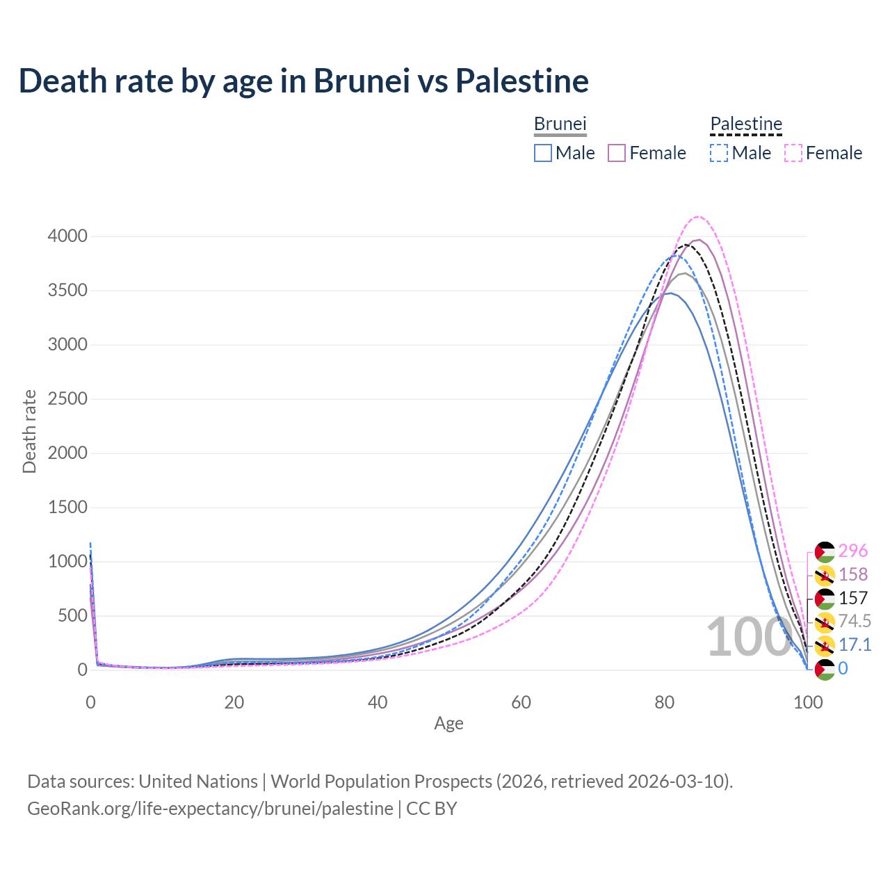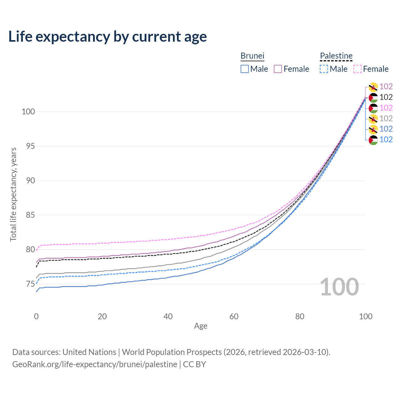 This life expectancy calculator shows the odds of living to 100, 95, 90, and below based on current age for both males and females in Brunei and Palestine, along with mean and median age of death. The calculations are based on the 2026 life tables (actuarial tables) from the UN World Population Prospects.