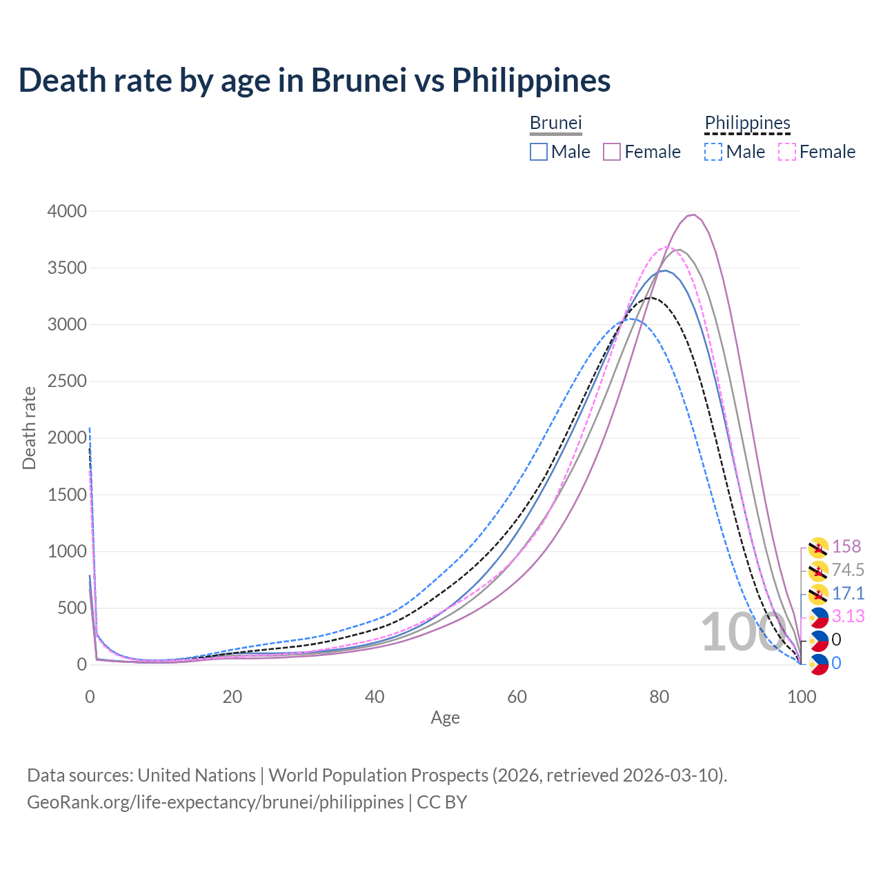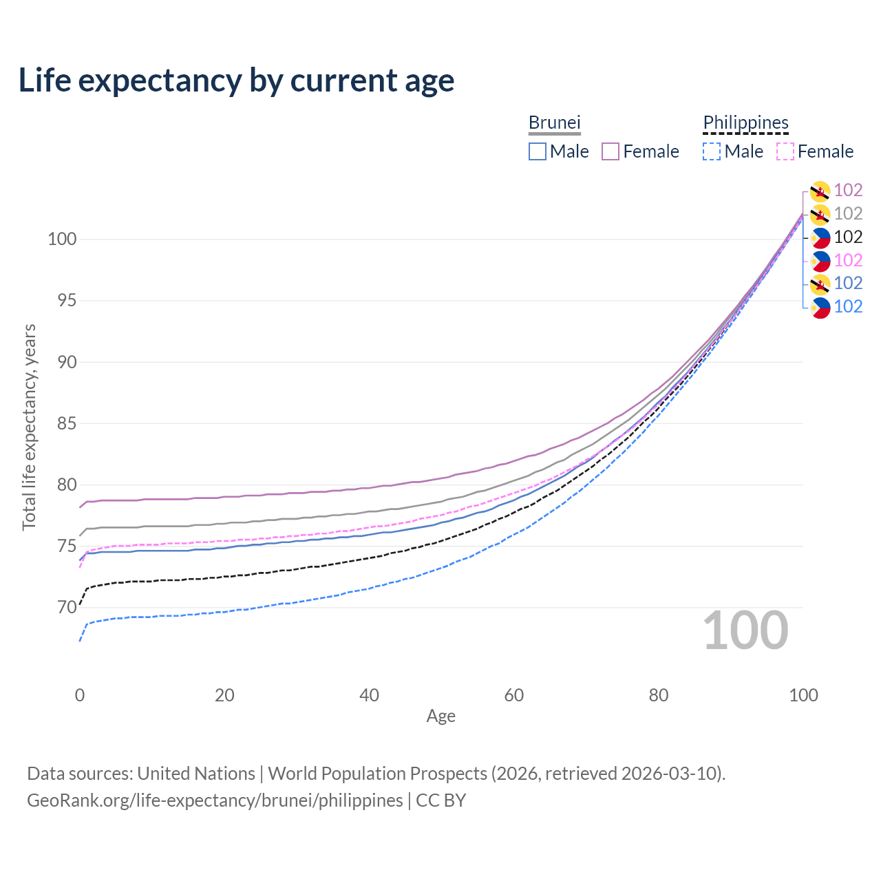 This life expectancy calculator shows the odds of living to 100, 95, 90, and below based on current age for both males and females in Brunei and the Philippines, along with mean and median age of death. The calculations are based on the 2026 life tables (actuarial tables) from the UN World Population Prospects.