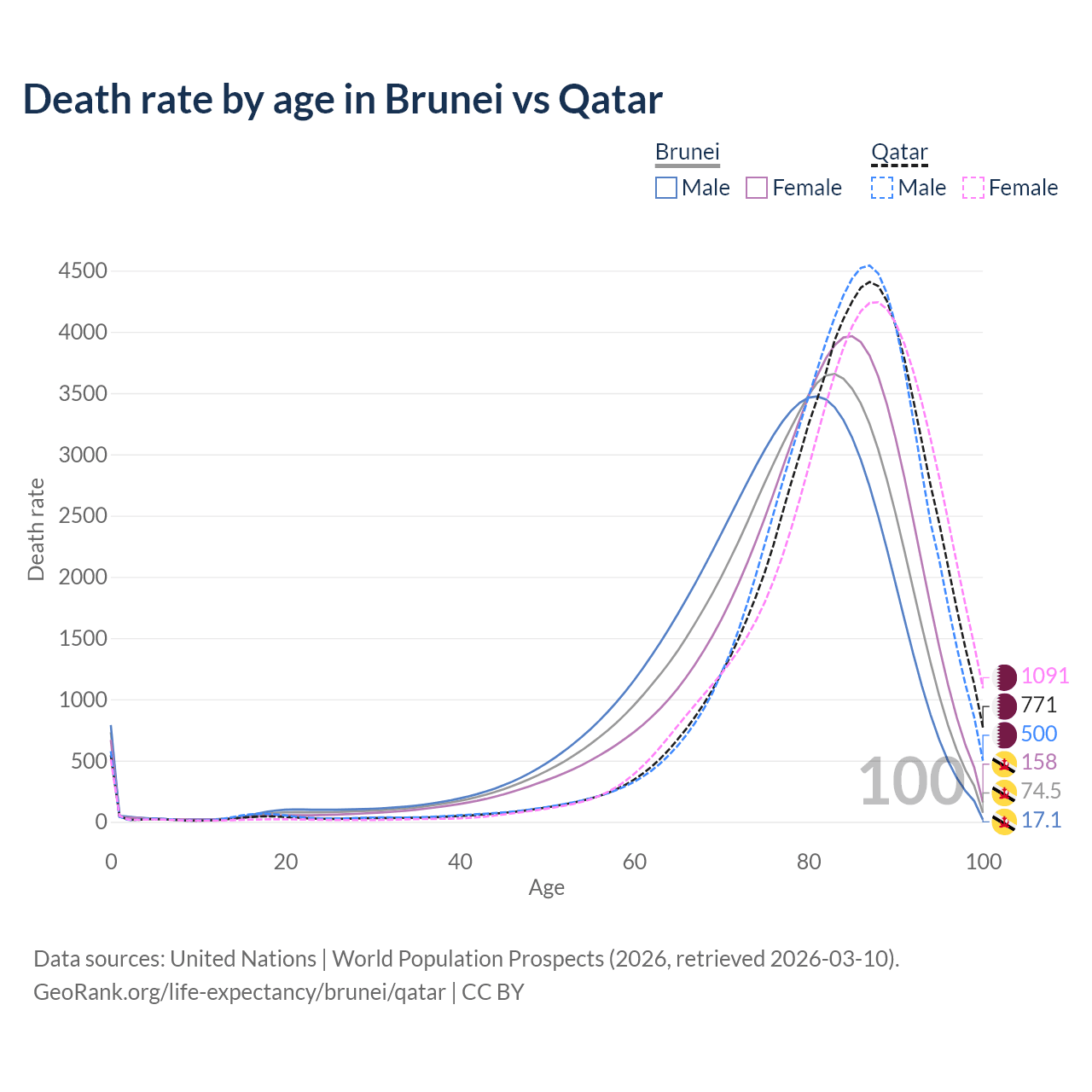 This life expectancy calculator shows the odds of living to 100, 95, 90, and below based on current age for both males and females in Brunei and Qatar, along with mean and median age of death. The calculations are based on the 2026 life tables (actuarial tables) from the UN World Population Prospects.