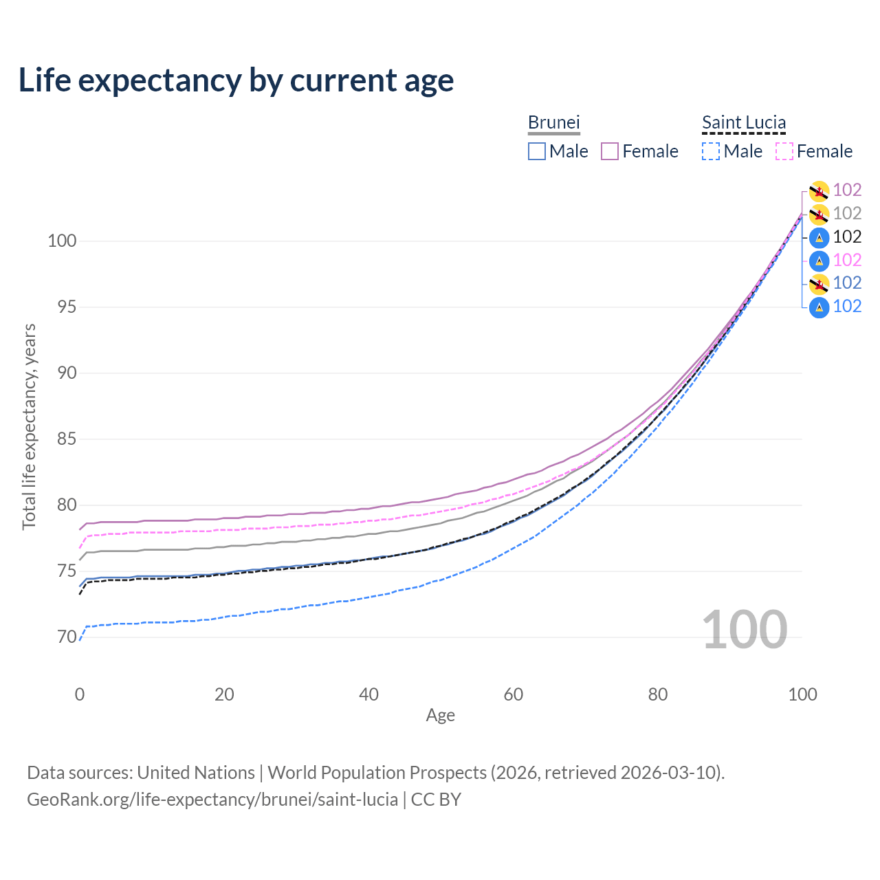 This life expectancy calculator shows the odds of living to 100, 95, 90, and below based on current age for both males and females in Brunei and Saint Lucia, along with mean and median age of death. The calculations are based on the 2026 life tables (actuarial tables) from the UN World Population Prospects.