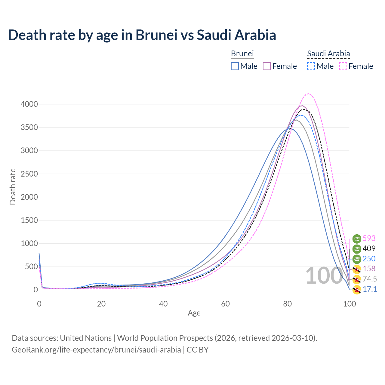 In Brunei, the most common age of death is 83, compared to 85 in Saudi Arabia. The median age of death is 79.2 in Brunei and 82.5 in Saudi Arabia, meaning only half of each cohort is expected to live past that age.