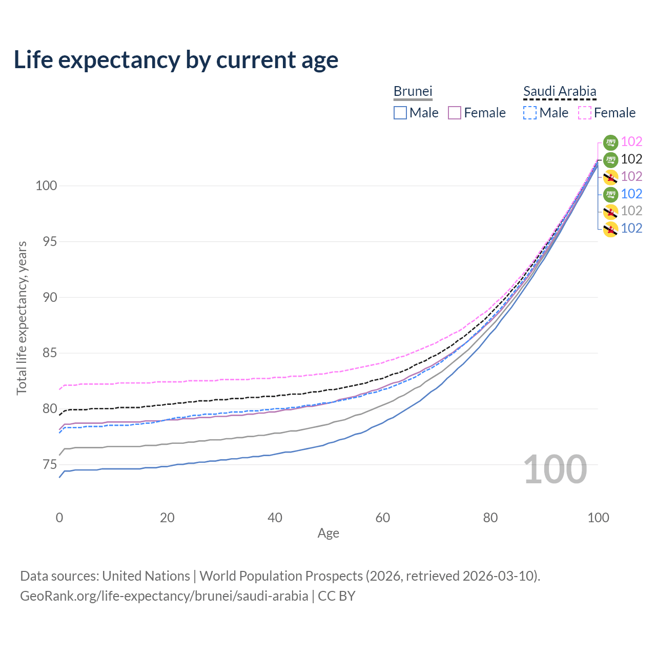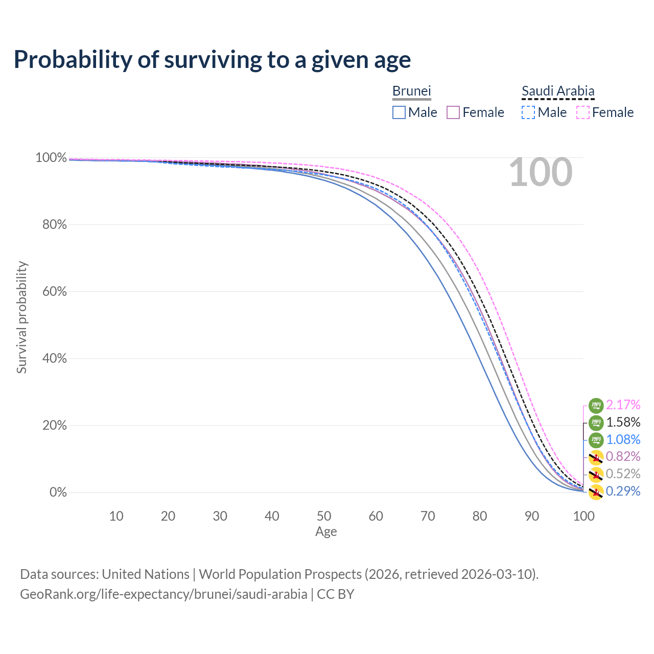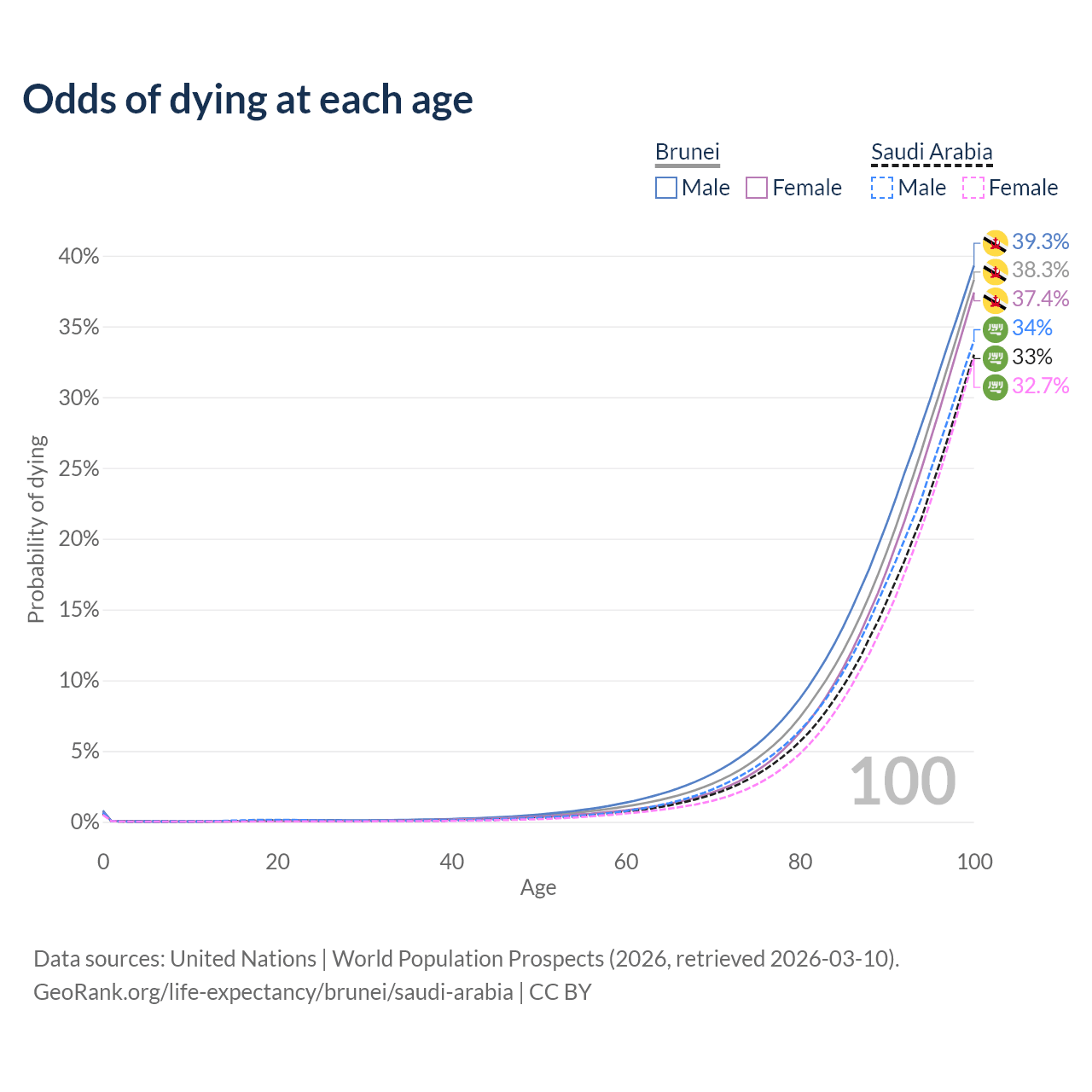 This life expectancy calculator shows the odds of living to 100, 95, 90, and below based on current age for both males and females in Brunei and Saudi Arabia, along with mean and median age of death. The calculations are based on the 2026 life tables (actuarial tables) from the UN World Population Prospects.