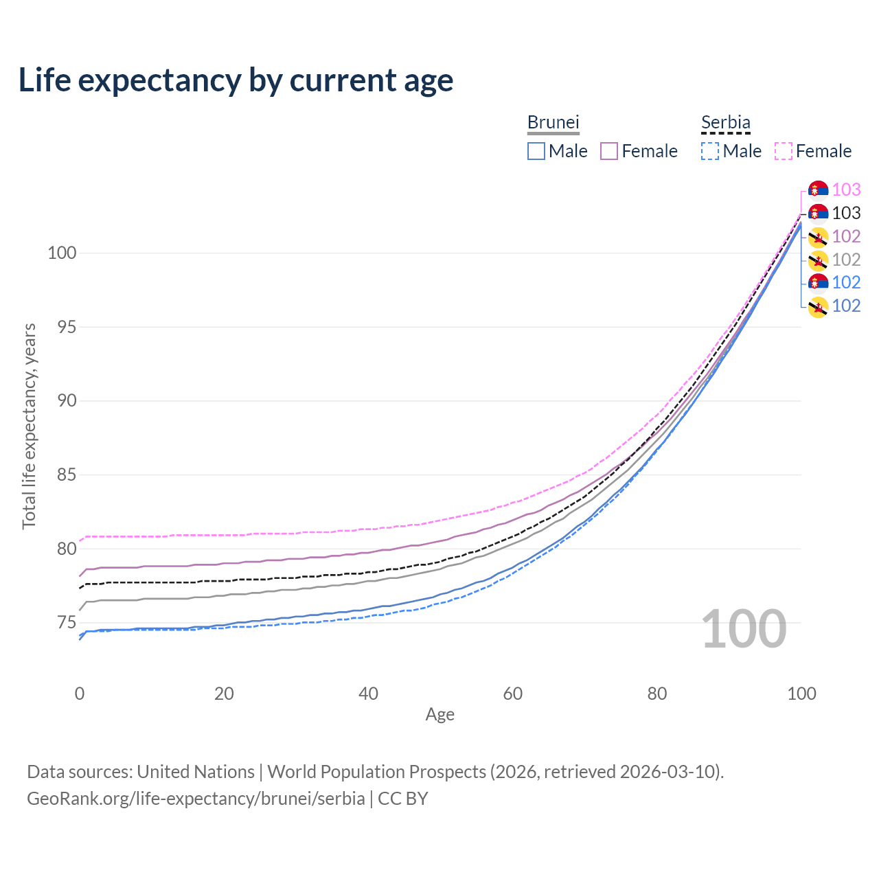 This life expectancy calculator shows the odds of living to 100, 95, 90, and below based on current age for both males and females in Brunei and Serbia, along with mean and median age of death. The calculations are based on the 2026 life tables (actuarial tables) from the UN World Population Prospects.